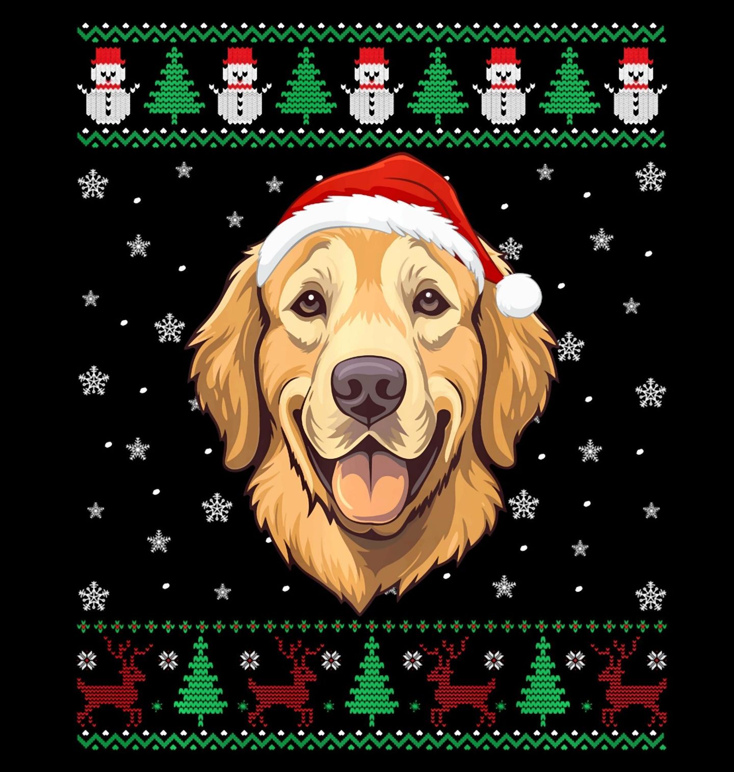 Pánské tričko Vánoční Zlatý retrívr. Uprostřed je usměvavý pes – zlatý retrívr – se santovskou čepicí, obklopený vločkami, sněhuláky, soby a vánočními stromky v klasickém ugly sweater stylu. Ideální dárek pro každého pejskaře, který miluje Vánoce.