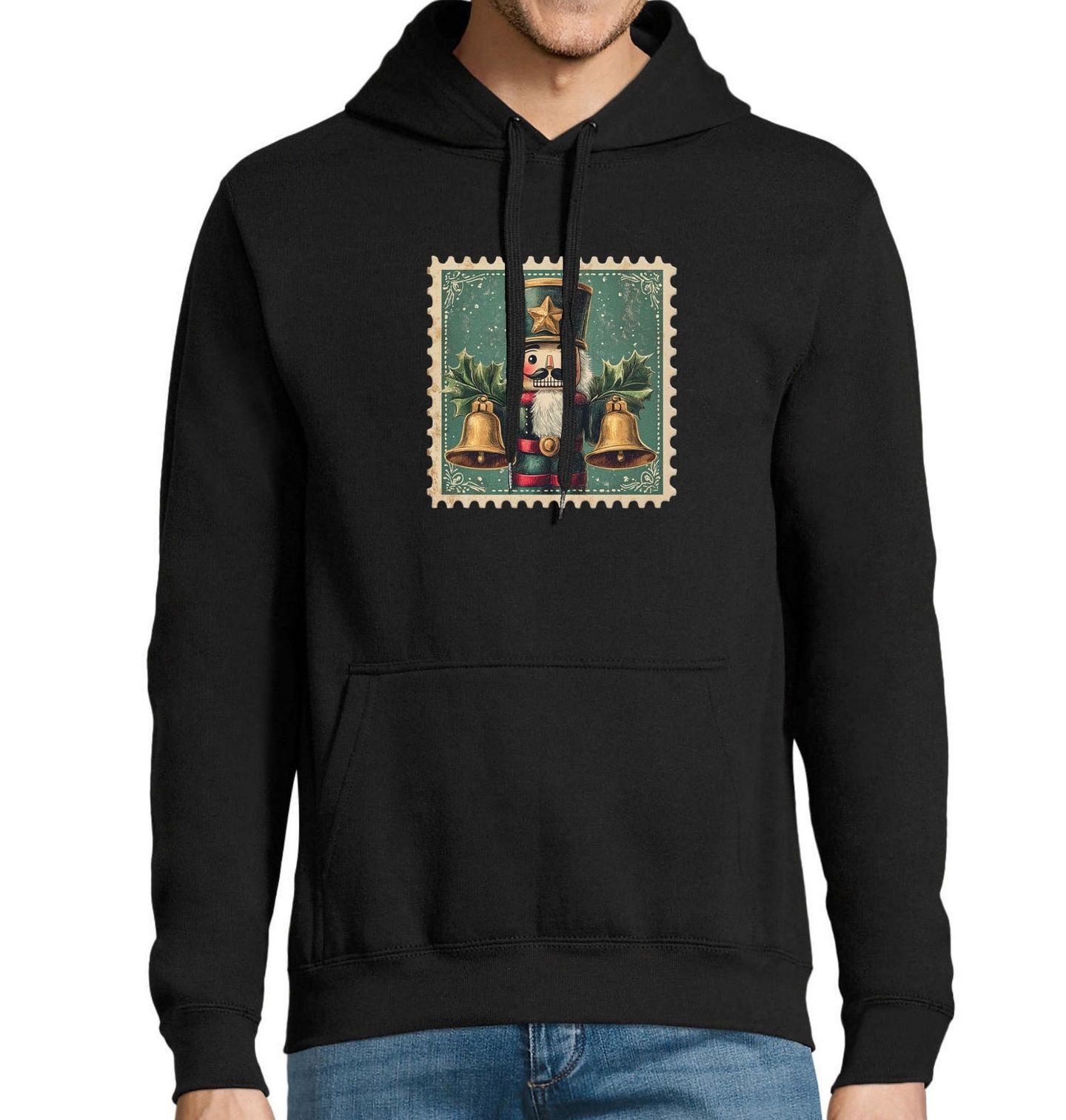 Pánská mikina Vánoční známka Louskáček. Kouzelný retro motiv inspirovaný poštovní známkou zobrazuje klasického louskáčka, ozdobeného zlatými zvonky, cesmínou a slavnostní uniformou. Tento nostalgický design přenese každého zpět do pohádkového dětství a vykouzlí ty pravé Vánoce.