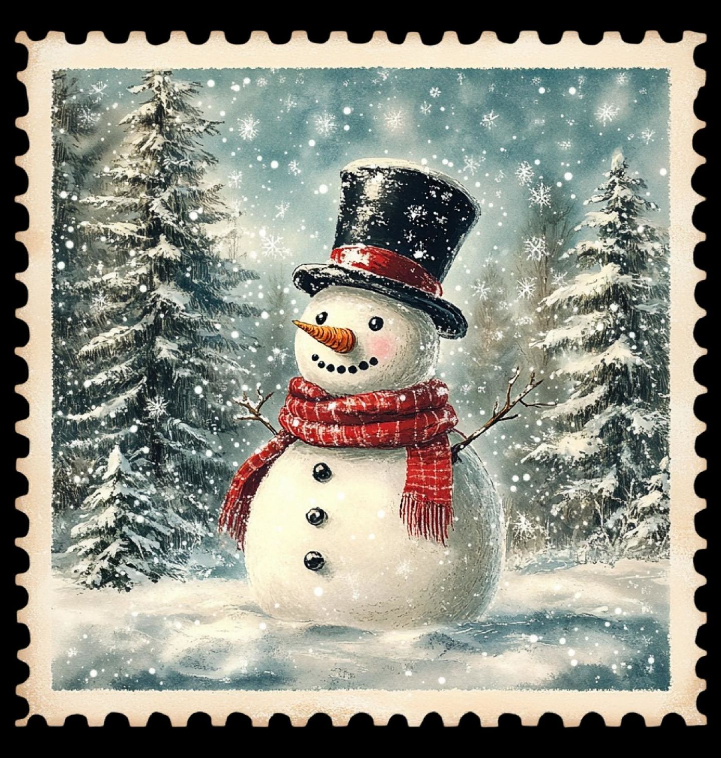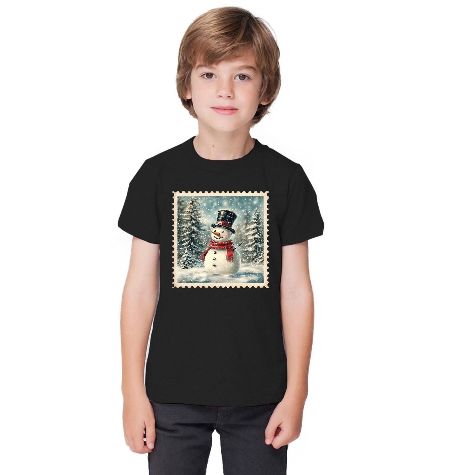 Dětské tričko Vánoční známka Sněhulák v Lese. Tento krásně ilustrovaný motiv v designu poštovní známky zachycuje sněhuláka s kloboukem a šálou, obklopeného zasněženým lesem. Kouzelný výjev navozuje atmosféru Vánoc a vrací nás do dětských zimních radovánek. Ideální pro každého, kdo miluje Vánoce, sníh a nostalgii starých pohlednic.