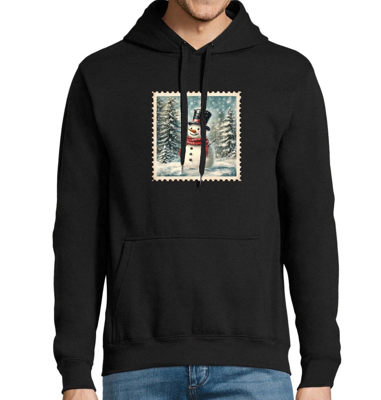 Pánská mikina Vánoční známka Sněhulák v Lese. Tento krásně ilustrovaný motiv v designu poštovní známky zachycuje sněhuláka s kloboukem a šálou, obklopeného zasněženým lesem. Kouzelný výjev navozuje atmosféru Vánoc a vrací nás do dětských zimních radovánek. Ideální pro každého, kdo miluje Vánoce, sníh a nostalgii starých pohlednic.