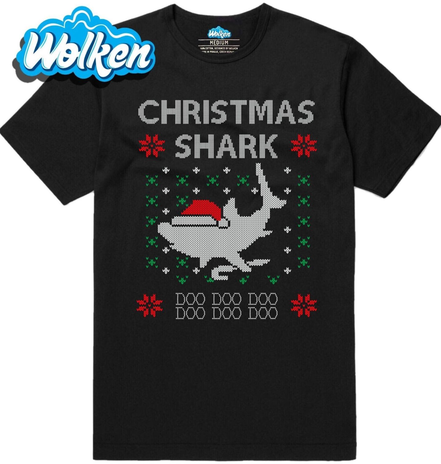 Pánské tričko Vánoční žralok Doo Doo Doo. Připravte se na pořádné Vánoce s kousnutím! Tento ugly sweater s motivem „Christmas Shark doo doo doo“ je ideální pro každého, kdo miluje žraloky a chytlavé písničky. Design spojuje slavné „Baby Shark“ meme s vánoční náladou – nechybí ani žralok v Santově čepici.