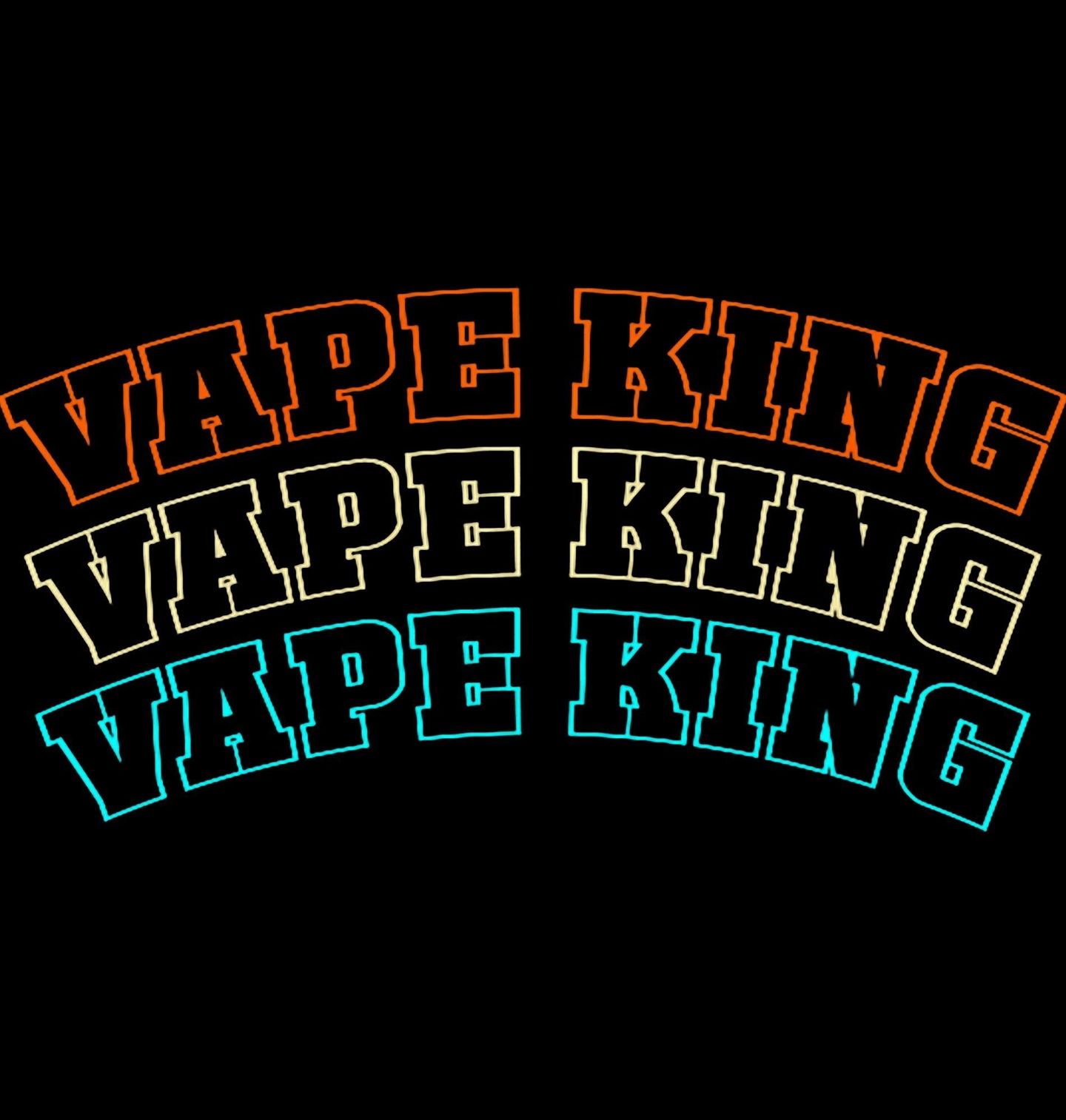 Pánské tričko Vape King. Výrazný typografický design ve stylu retro, na kterém je opakovaně zobrazen nápis „VAPE KING“, což v překladu znamená „král vapování (kouření)“. Barevné obrysy písma v odstínech oranžové, béžové a tyrkysové vytvářejí zajímavý vintage efekt, který skvěle vynikne na tmavém podkladu.