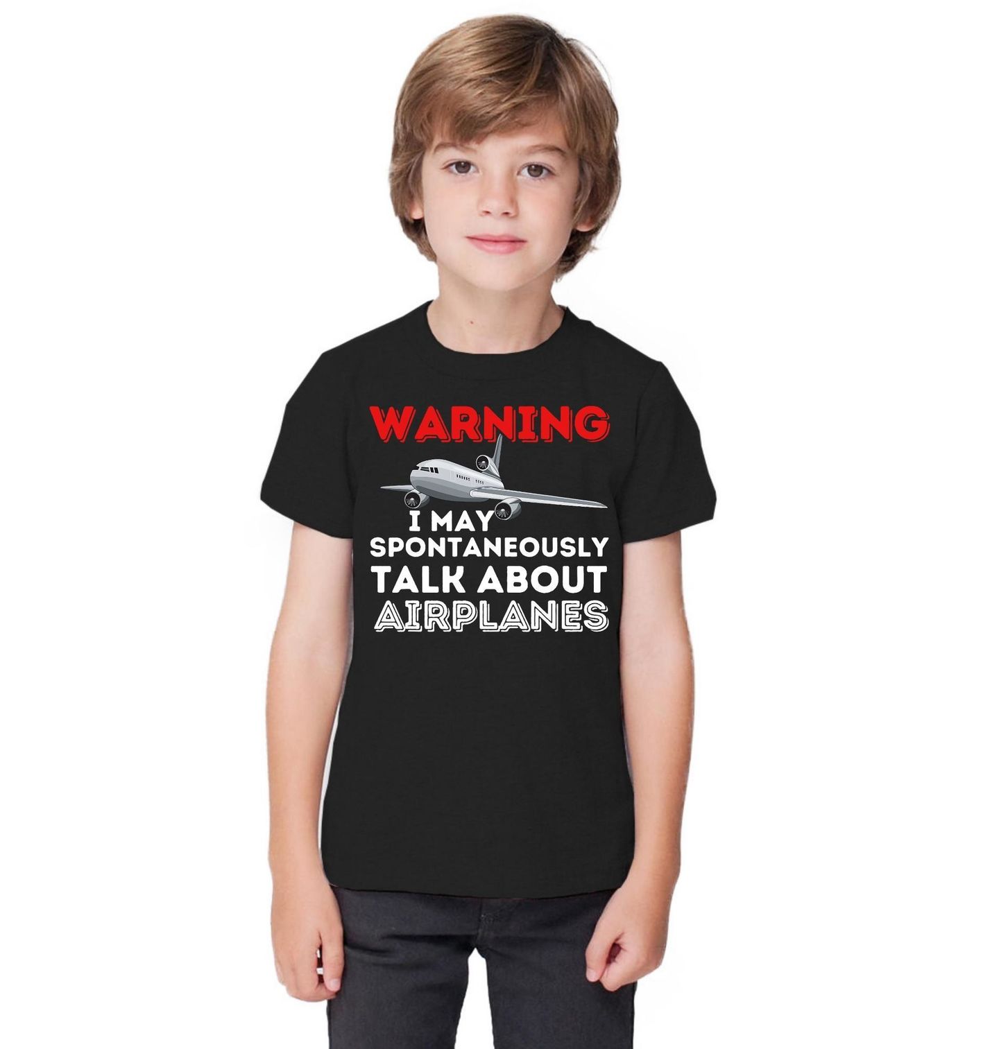 Dětské tričko Varování Letecký Nadšenec. Humorný motiv letadla obsahuje text „WARNING – I MAY SPONTANEOUSLY TALK ABOUT AIRPLANES“, což znamená „Varování – mohu spontánně mluvit o letadlech“. Perfektní pro každého, kdo miluje letadla natolik, že o nich mluví kdykoliv.