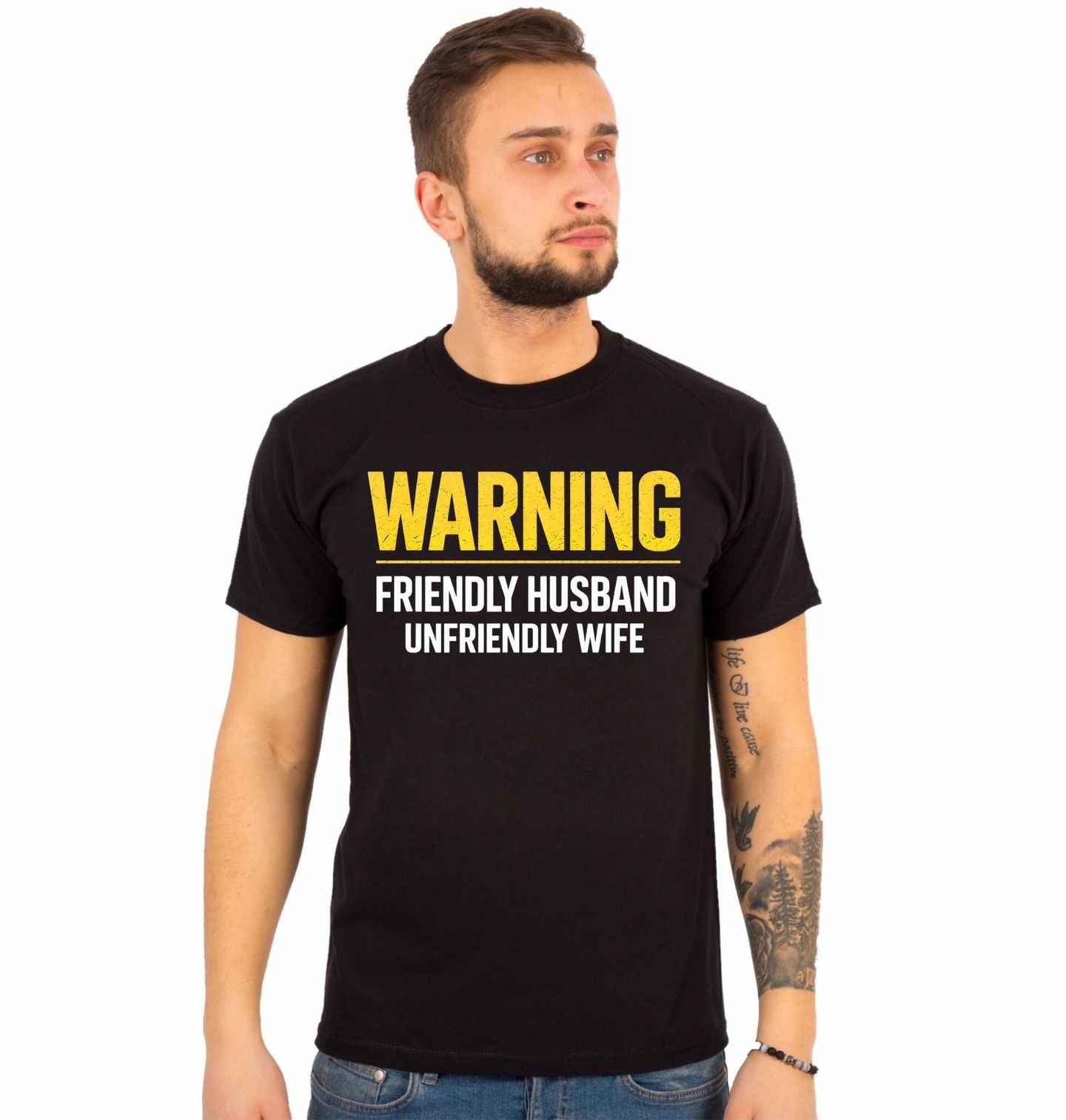 Pánské tričko Varování Přátelský Manžel Nepřátelská Manželka. Humorný textový design s výrazným nápisem „WARNING – FRIENDLY HUSBAND, UNFRIENDLY WIFE“, což znamená „Varování – přátelský manžel, nepřátelská manželka“. Tento motiv využívá ironický humor o manželství a vztazích a je ideální pro ty, kteří mají rádi sarkastické a odlehčené vtipy o rodinném životě.