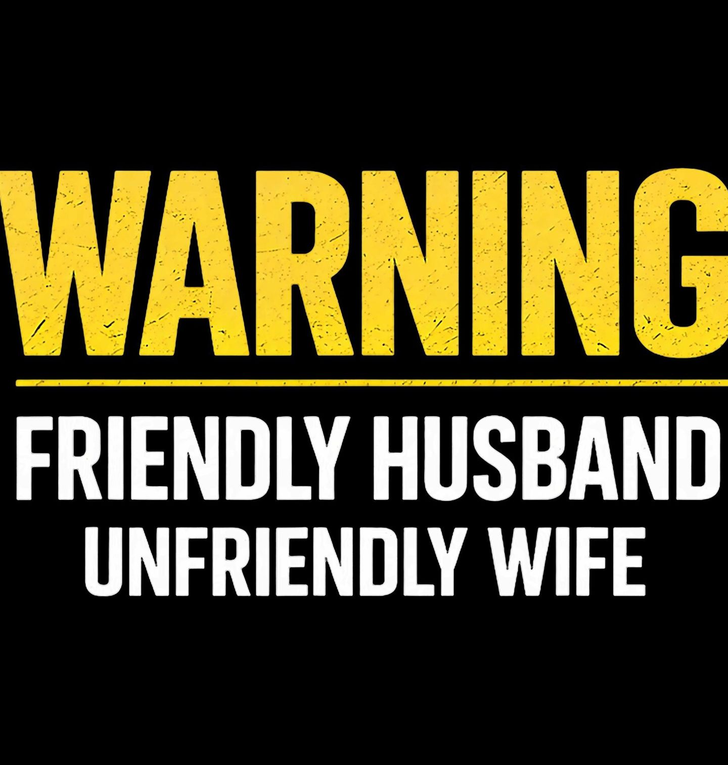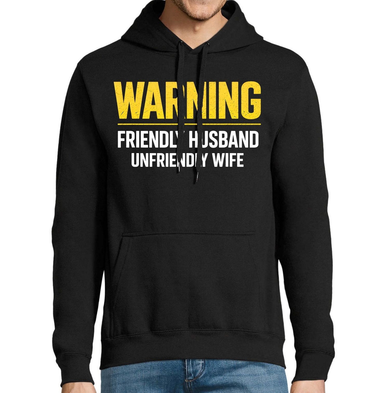 Pánská mikina Varování Přátelský Manžel Nepřátelská Manželka. Humorný textový design s výrazným nápisem „WARNING – FRIENDLY HUSBAND, UNFRIENDLY WIFE“, což znamená „Varování – přátelský manžel, nepřátelská manželka“. Tento motiv využívá ironický humor o manželství a vztazích a je ideální pro ty, kteří mají rádi sarkastické a odlehčené vtipy o rodinném životě.