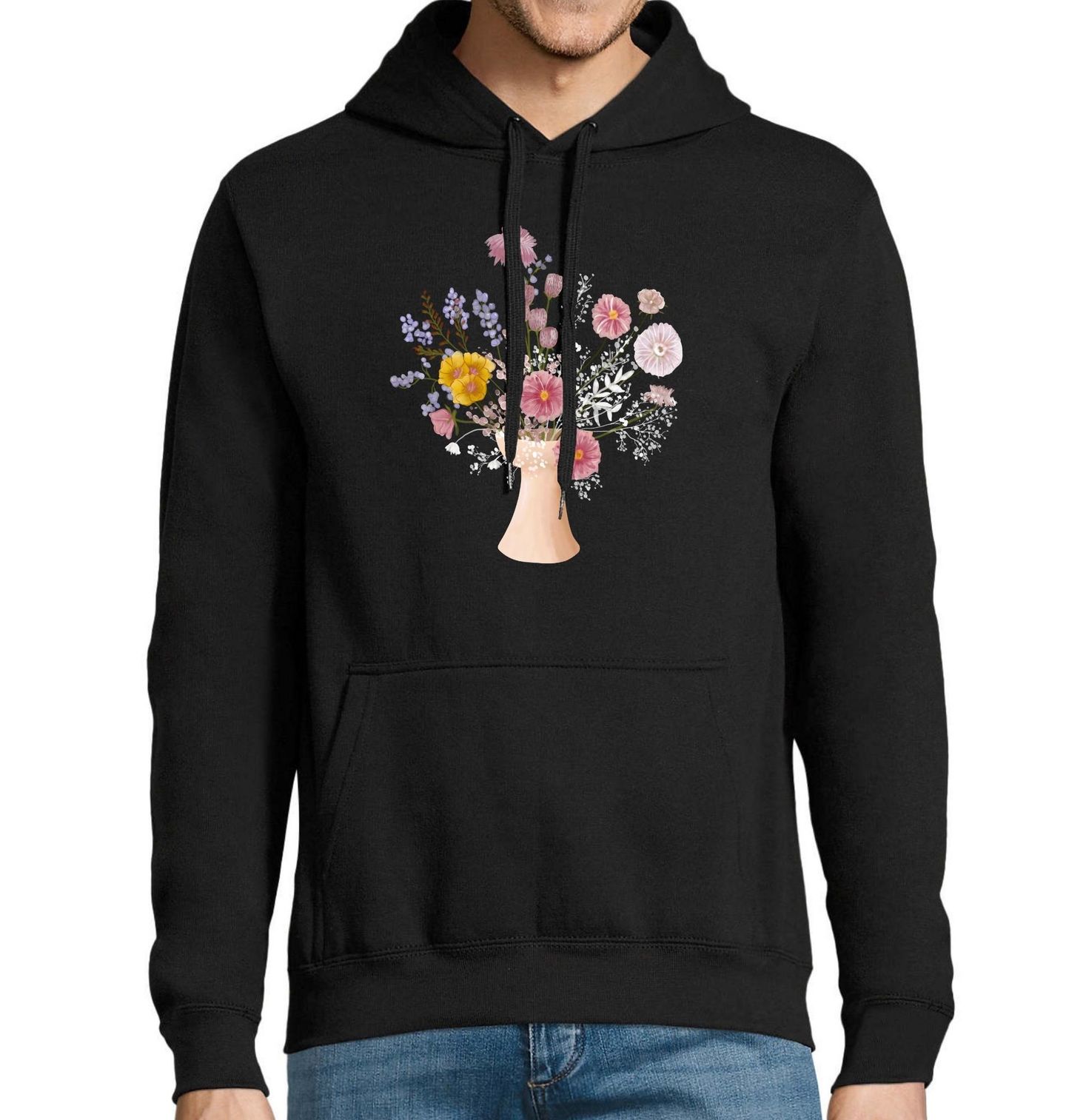 Pánská mikina Váza plná Květin. Romantický design zobrazuje ručně kreslenou vázu plnou barevných květin – od lučních až po okrasné – a evokuje klid venkova i lehkost letních dnů. Perfektní dárek pro milovníky květin, přírody a jemné estetiky. Motiv květiny a váza se skvěle hodí k ležérnímu i elegantnímu stylu.