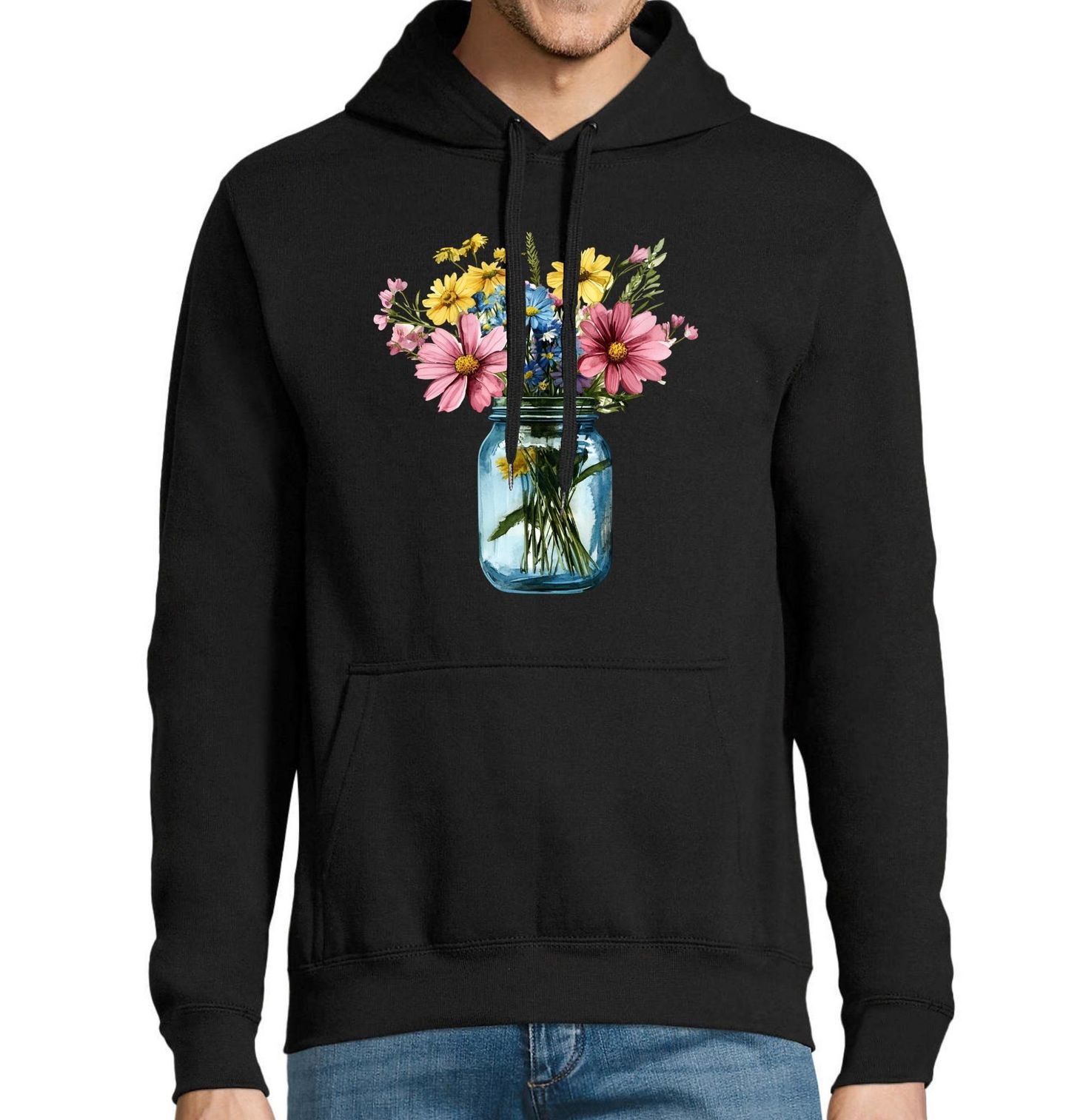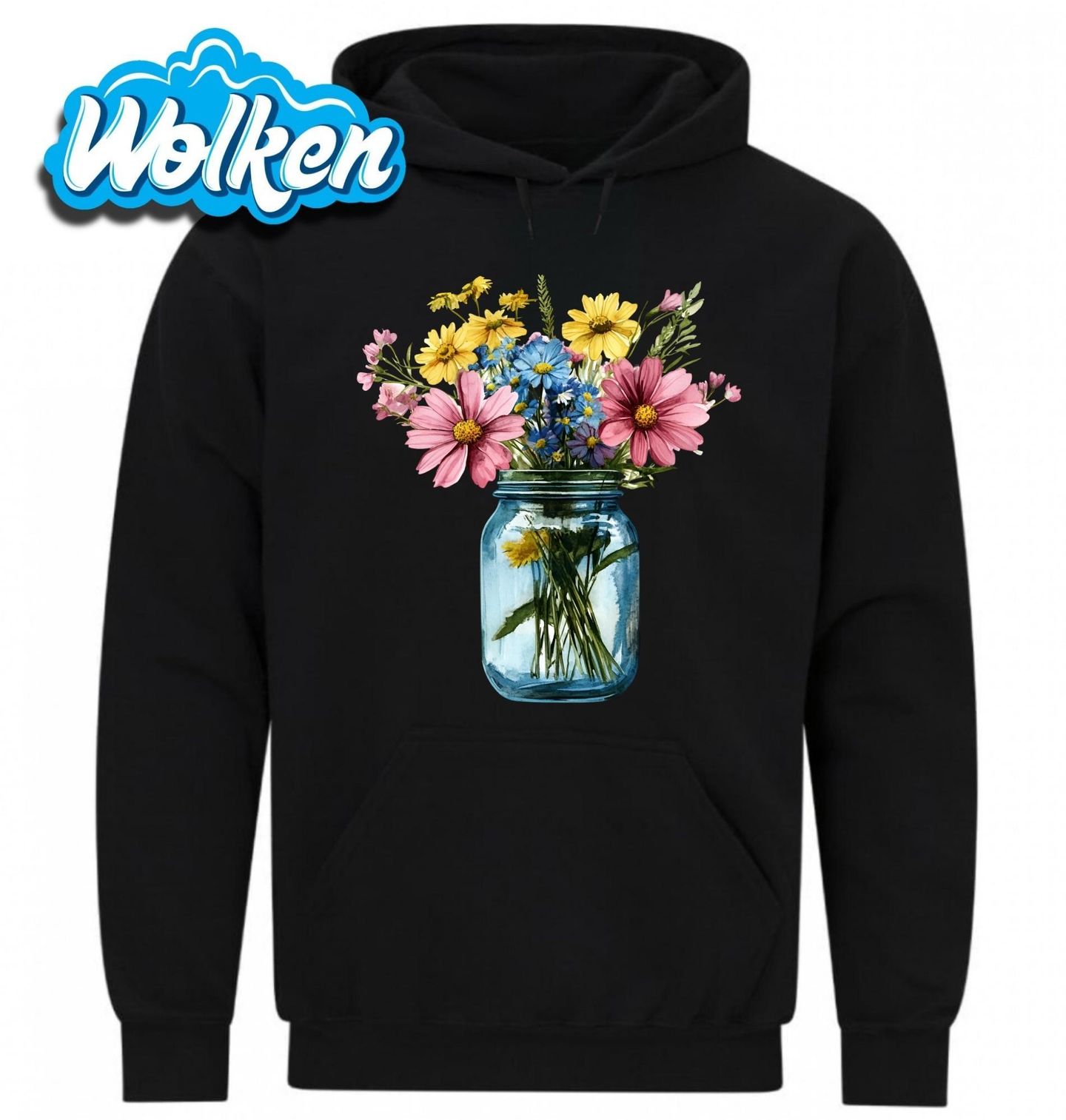 Pánská mikina Váza plná květin Umění květinářky. Tento krásný motiv zachycuje skleněnou vázu plnou lučních květin, včetně růžových kosmateců, žlutých kopretin, modrých pomněnek a dalších jemných květů. Jemný akvarelový styl dodává motivu lehkost a eleganci, která připomíná ručně uvázanou kytici od zkušené květinářky.