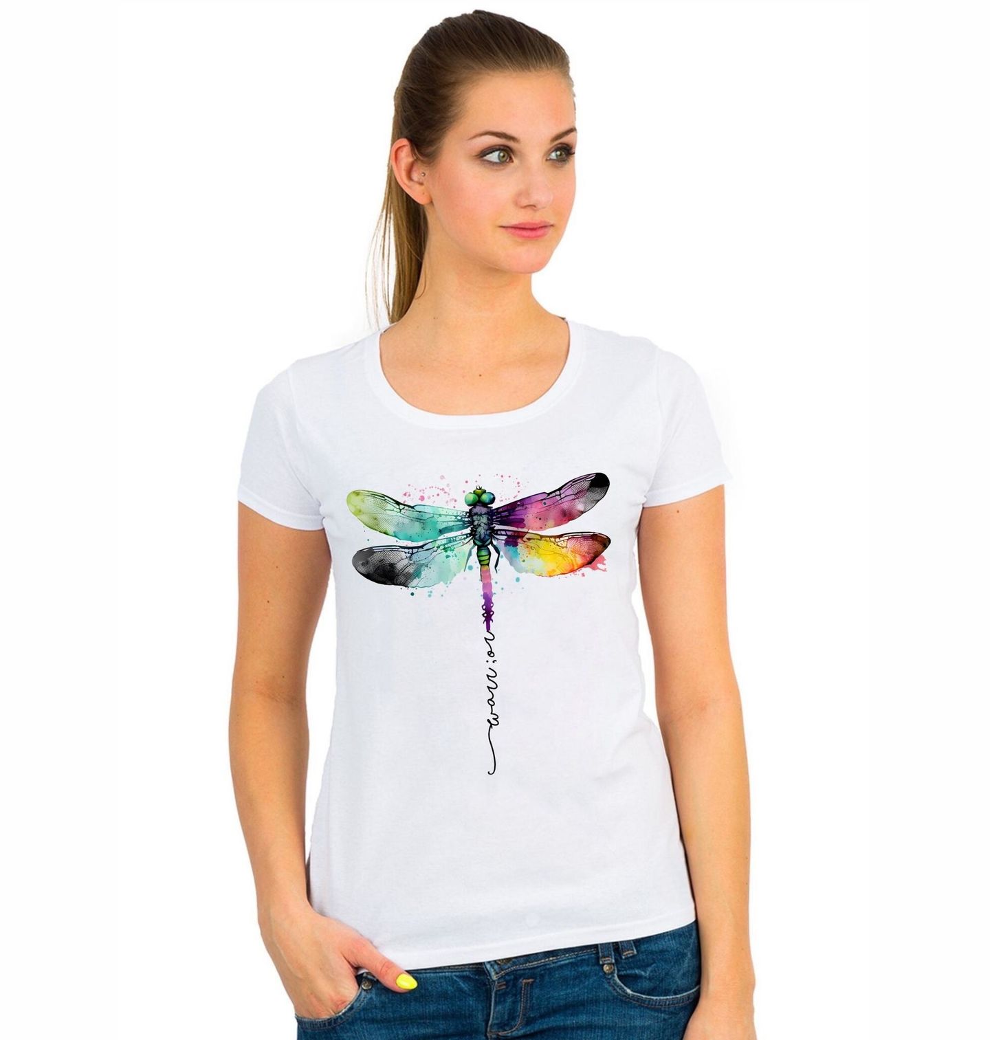 Dámské tričko Vážka Bojovník Warrior. Originální motiv zobrazuje vážku v moderním akvarelovém stylu plném barev a energie. Detailní křídla se prolínají s výraznými barevnými efekty a podél těla vážky je umístěn nápis „warrior“ (bojovník), který dodává designu silný význam. Vážka symbolizuje změnu, sílu a svobodu, zatímco slovo warrior vyjadřuje odhodlání, vnitřní sílu a schopnost překonávat překážky.