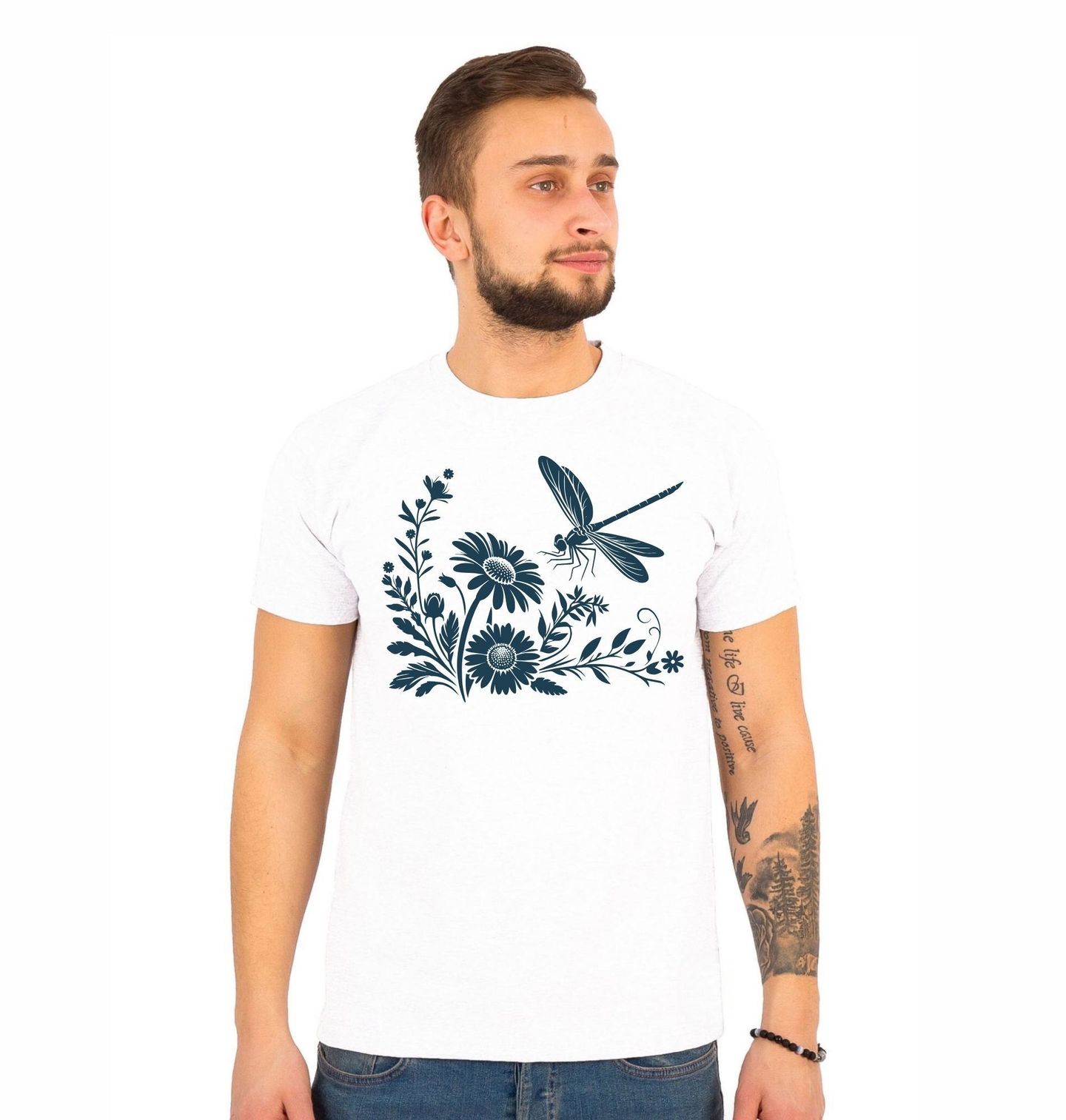 Pánské tričko Vážka na Květinách. Elegantní motiv zobrazuje vážku v letu nad rozkvetlými květiny, které vytvářejí harmonickou přírodní kompozici. Jednoduché linie a siluetové zpracování dodávají designu klidný a nadčasový vzhled. Vážka symbolizuje lehkost, svobodu a proměnu, zatímco květiny přinášejí jemnost, krásu a spojení s přírodou.