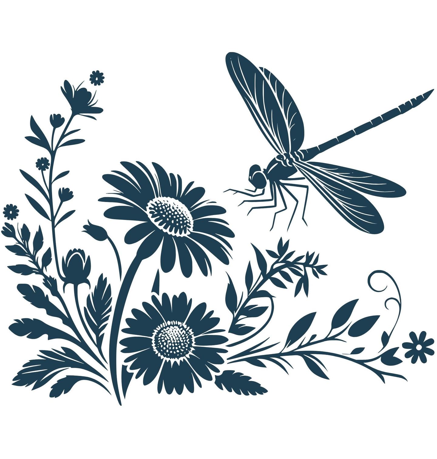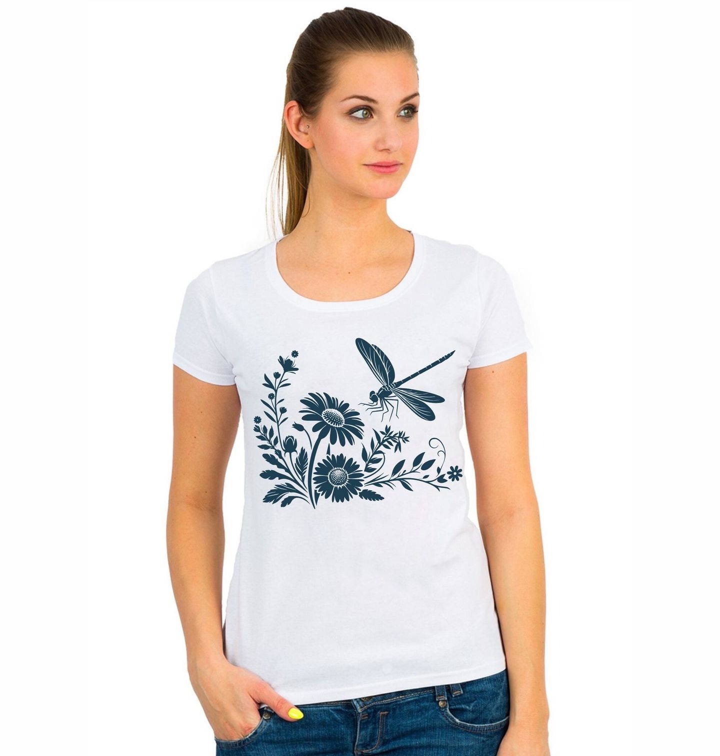 Dámské tričko Vážka na Květinách. Elegantní motiv zobrazuje vážku v letu nad rozkvetlými květiny, které vytvářejí harmonickou přírodní kompozici. Jednoduché linie a siluetové zpracování dodávají designu klidný a nadčasový vzhled. Vážka symbolizuje lehkost, svobodu a proměnu, zatímco květiny přinášejí jemnost, krásu a spojení s přírodou.