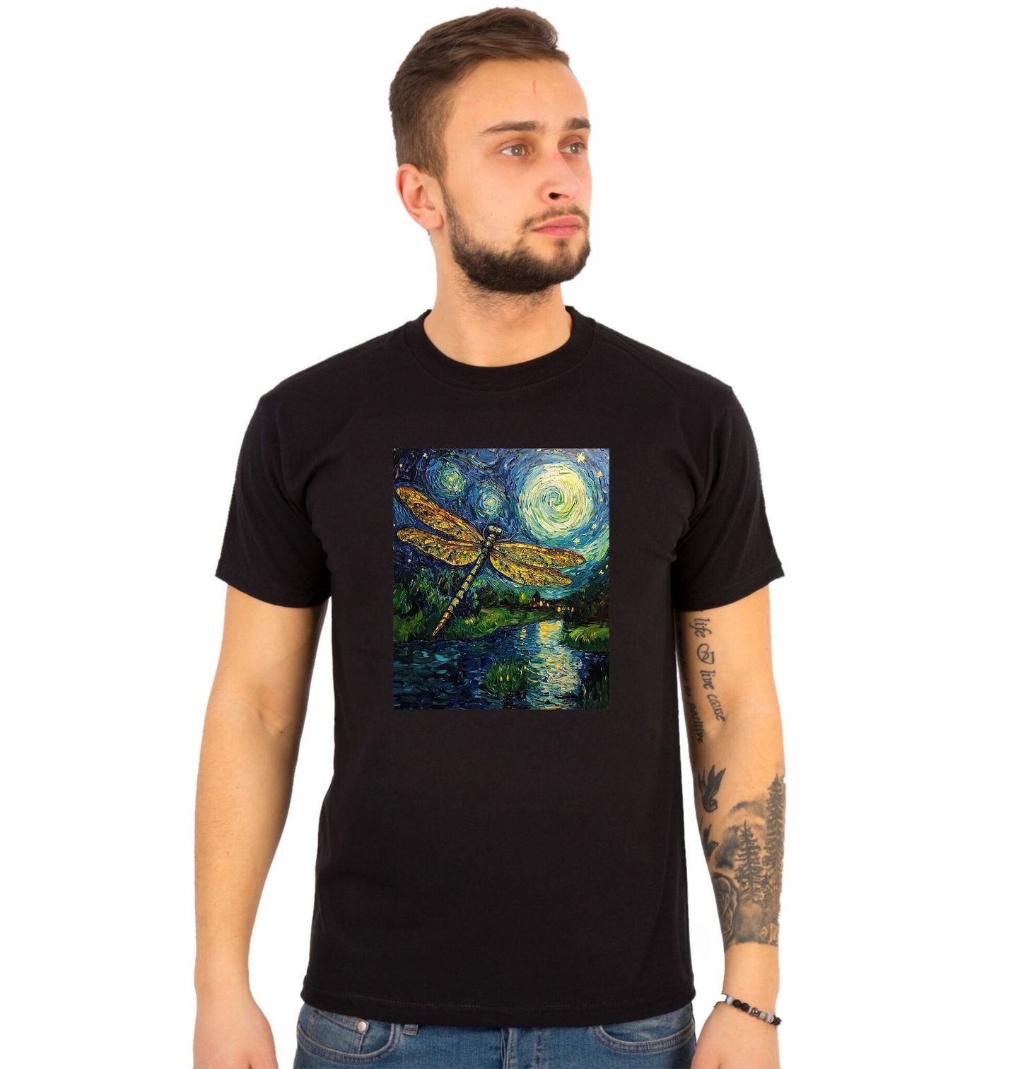 Pánské tričko Vážka ve Hvězdné noci. Jedinečný umělecký motiv, který spojuje klasické dílo Hvězdná noc a fantazii moderní ilustrace. V popředí obrazu se vznáší detailně zpracovaná vážka, jejíž křídla září nad noční krajinou, malovanou ve stylu, kterým je proslulý Vincent van Gogh.