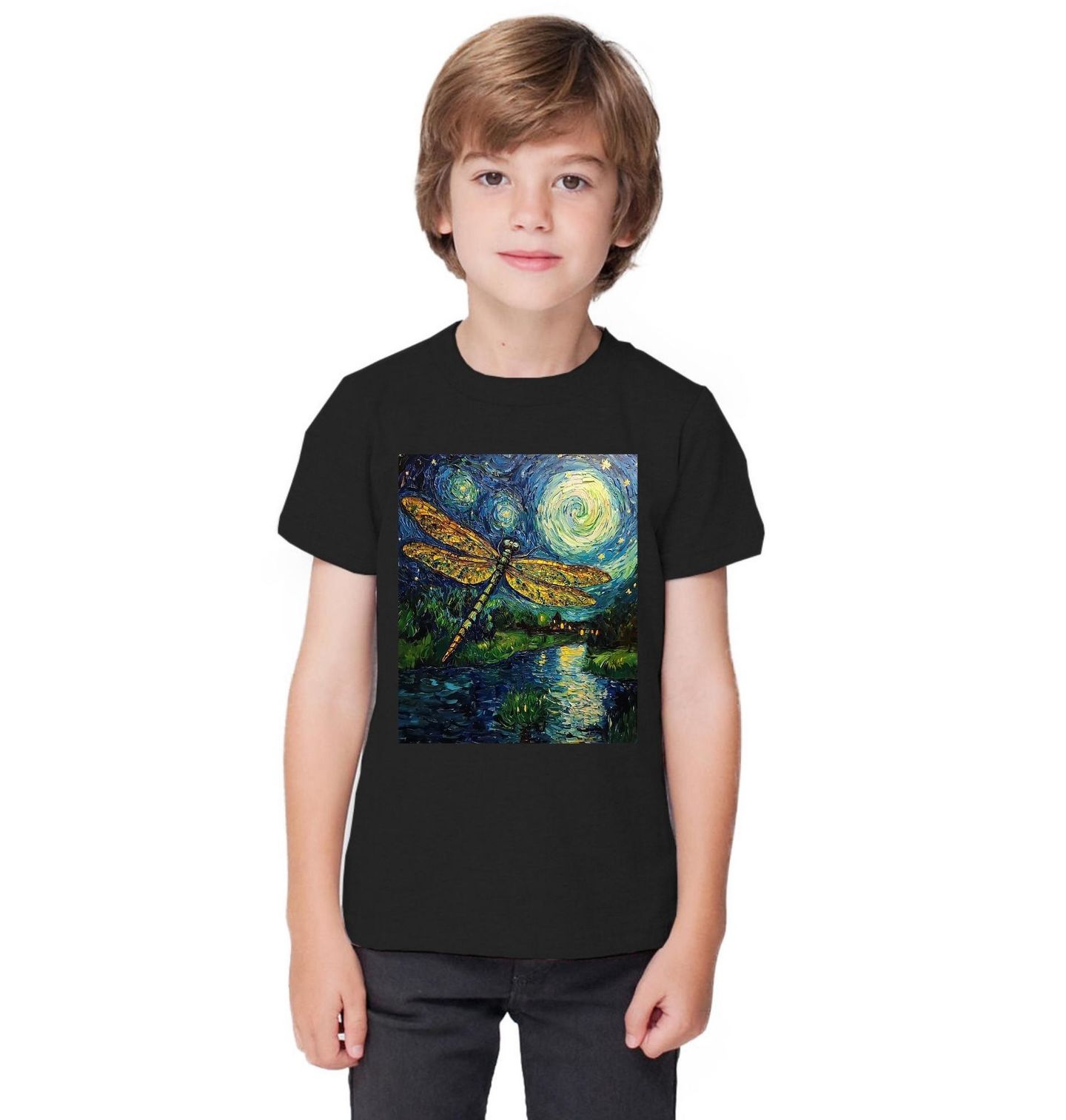 Dětské tričko Vážka ve Hvězdné noci. Jedinečný umělecký motiv, který spojuje klasické dílo Hvězdná noc a fantazii moderní ilustrace. V popředí obrazu se vznáší detailně zpracovaná vážka, jejíž křídla září nad noční krajinou, malovanou ve stylu, kterým je proslulý Vincent van Gogh.