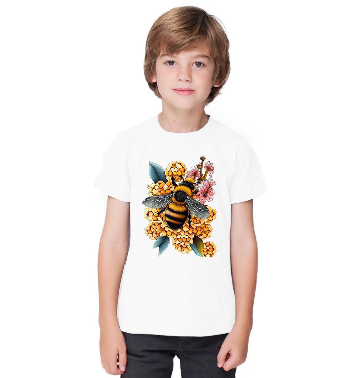 Dětské tričko Včela opylující Žluté Květy. Detailní a elegantní motiv, na kterém je včela zachycená mezi bohatými květy a strukturou plástve. Ilustrace působí přírodně, jemně a zároveň velmi živě díky propracovaným detailům křídel, těla i okolních květů. Celý motiv oslavuje krásu přírody a harmonii mezi hmyzem a květinami.
