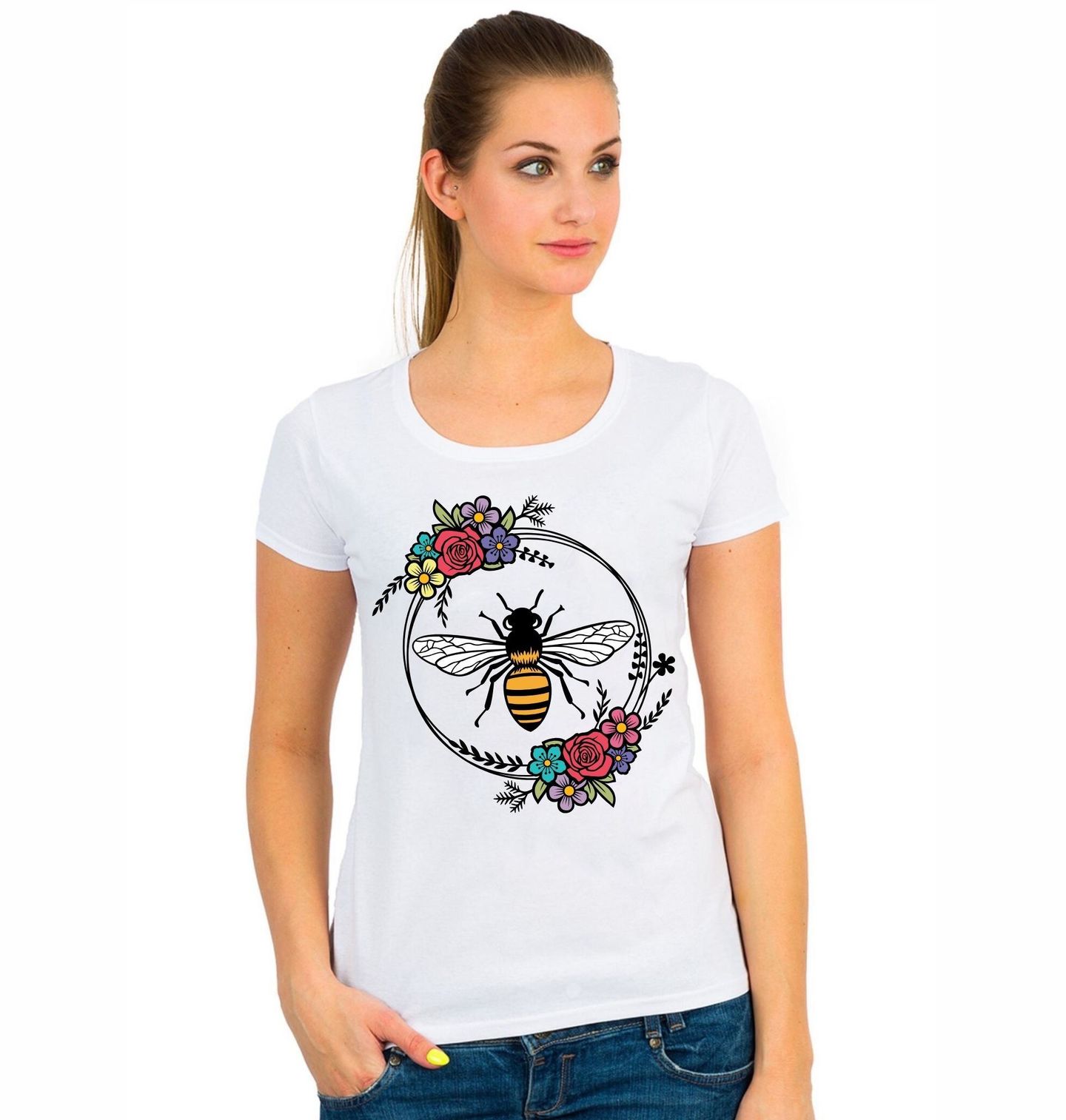 Dámské tričko Včela v Kruhu Květin. Elegantní motiv, kde včela jako důležitý hmyz vyniká uprostřed jemného věnce, který tvoří barevné květiny. Spojení přírody a detailu vytváří harmonický design plný života a přirozené krásy. Vhodný dárek pro milovníky přírody a včelaře.