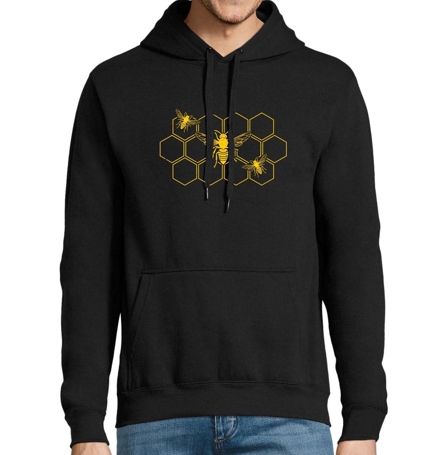 Pánská mikina Včelí plástev. Včelí plástve – voskové struktury tvořené šestiúhelníky, část včelího úlu, kde se ukládá med, pyl i larvy. Včely jsou na obrázku stylizované a rozesazené mezi těmito plástvemi, což dohromady vytváří abstraktní, ale jasně rozpoznatelný motiv úlu a včely.