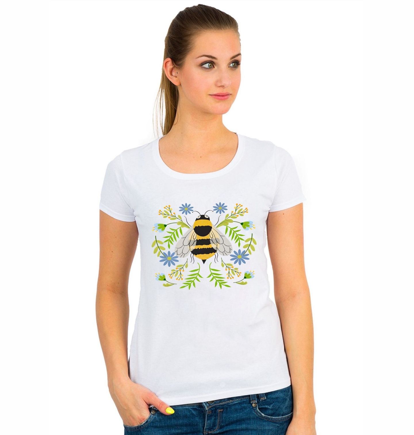 Dámské tričko Včelka na Květinách. Veselý motiv, ve kterém hraje hlavní roli včela obklopená rozkvetlými květinami a zelenými listy. Tento jemný a hravý design oslavuje krásu přírody a důležitost včel v našem ekosystému. Skvěle se hodí pro milovníky přírody, zahradničení i včelařství.