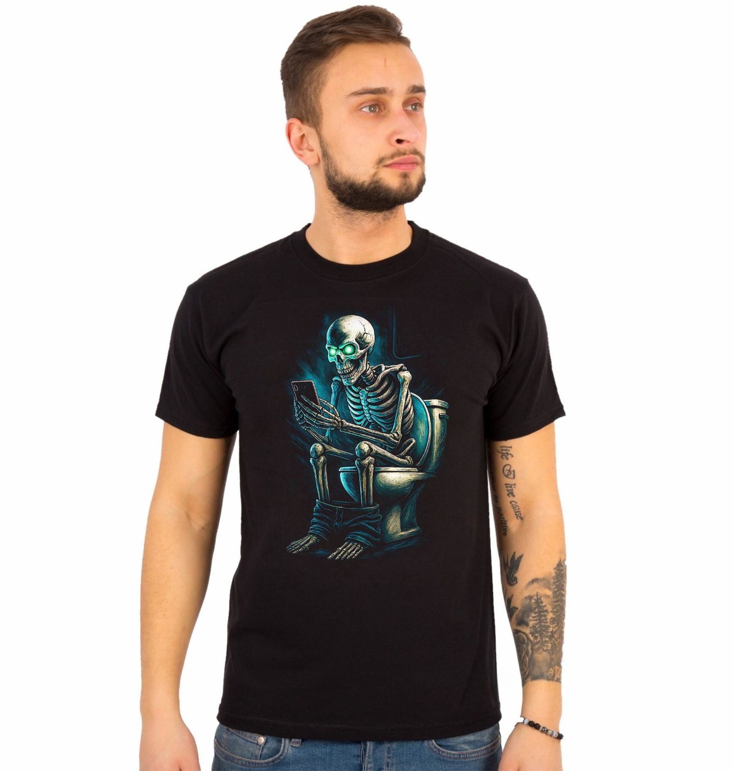 Pánské tričko Věčně Scrolující Kostlivec na Záchodě. Originální a vtipný motiv, kde kostlivec sedí na wc a místo klidu projíždí mobil – protože ani smrt tě neodpojí od online světa. Design kombinuje černý humor, moderní závislost na technologiích a temnou estetiku do jednoho výrazného vizuálu. Ideální pro všechny, kteří milují sarkasmus, memes a trochu morbidní styl.