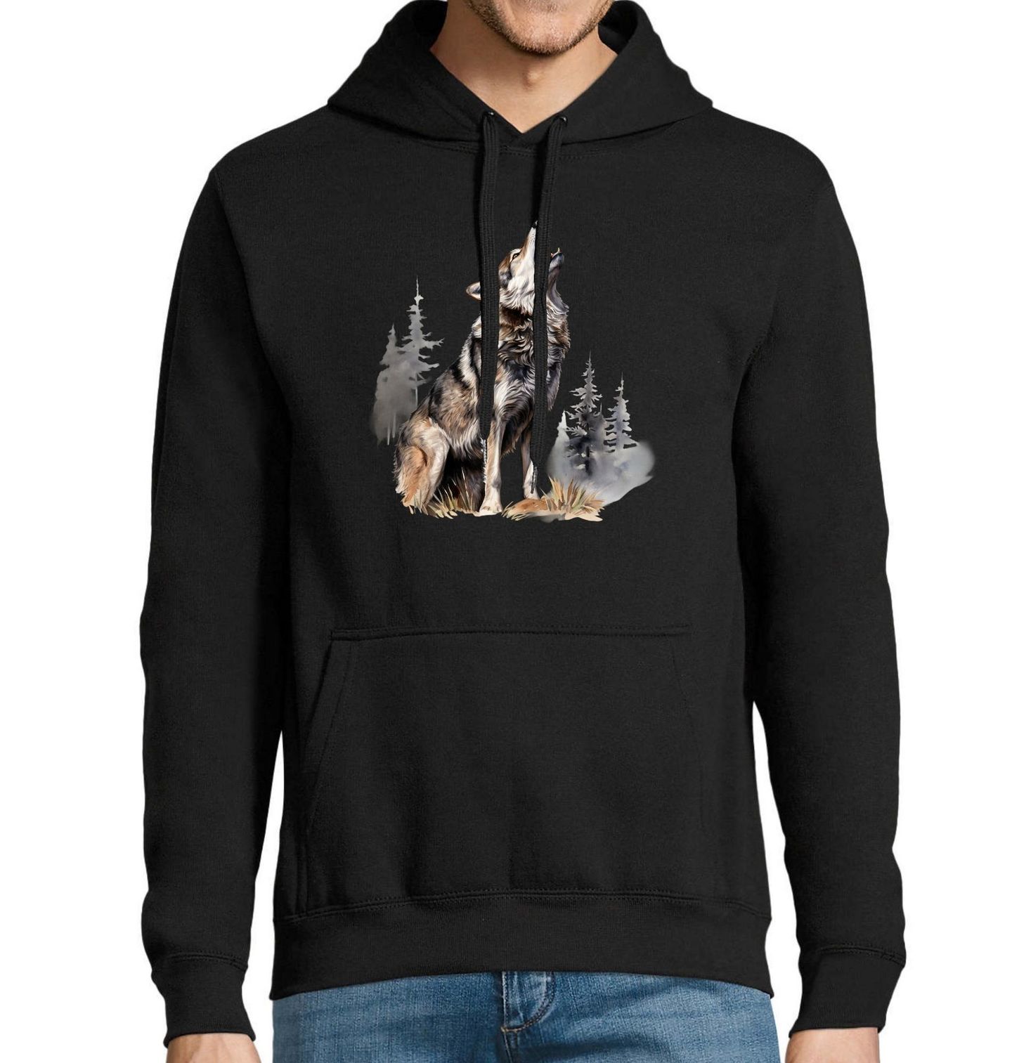 Pánská mikina Věčně Volající Vlk. Tento design zobrazuje vlka, který výt směrem k měsíci, jeho volání zní v širé přírodě, kde se spojují síla a volnost. S jemnými akvarelovými detaily a přírodními motivy tento motiv evokuje sílu, divokost a volnost, které jsou symbolem vlků.