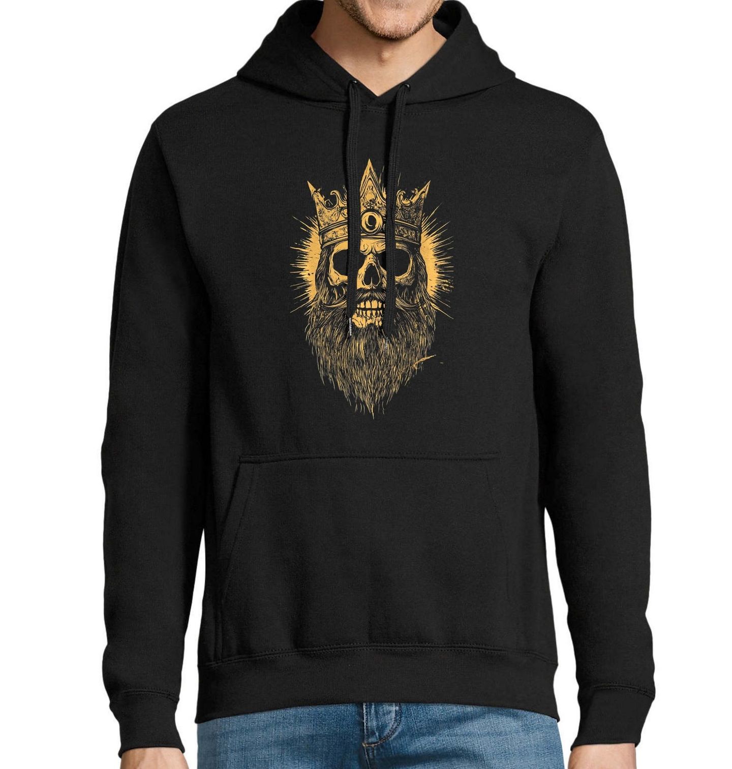 Pánská mikina Věčný Král Smrti. Tento design osloví fanoušky gotiky, metalové estetiky i mystiky. Ideální volba pro ty, kdo se nebojí vyniknout. Dominantní lebka vyzařuje respekt, sílu a královskou autoritu – korunovaná majestátní korunkou, která z ní dělá skutečného vládce říše mrtvých. Vousy dodávají motivu mužnost a charakter.