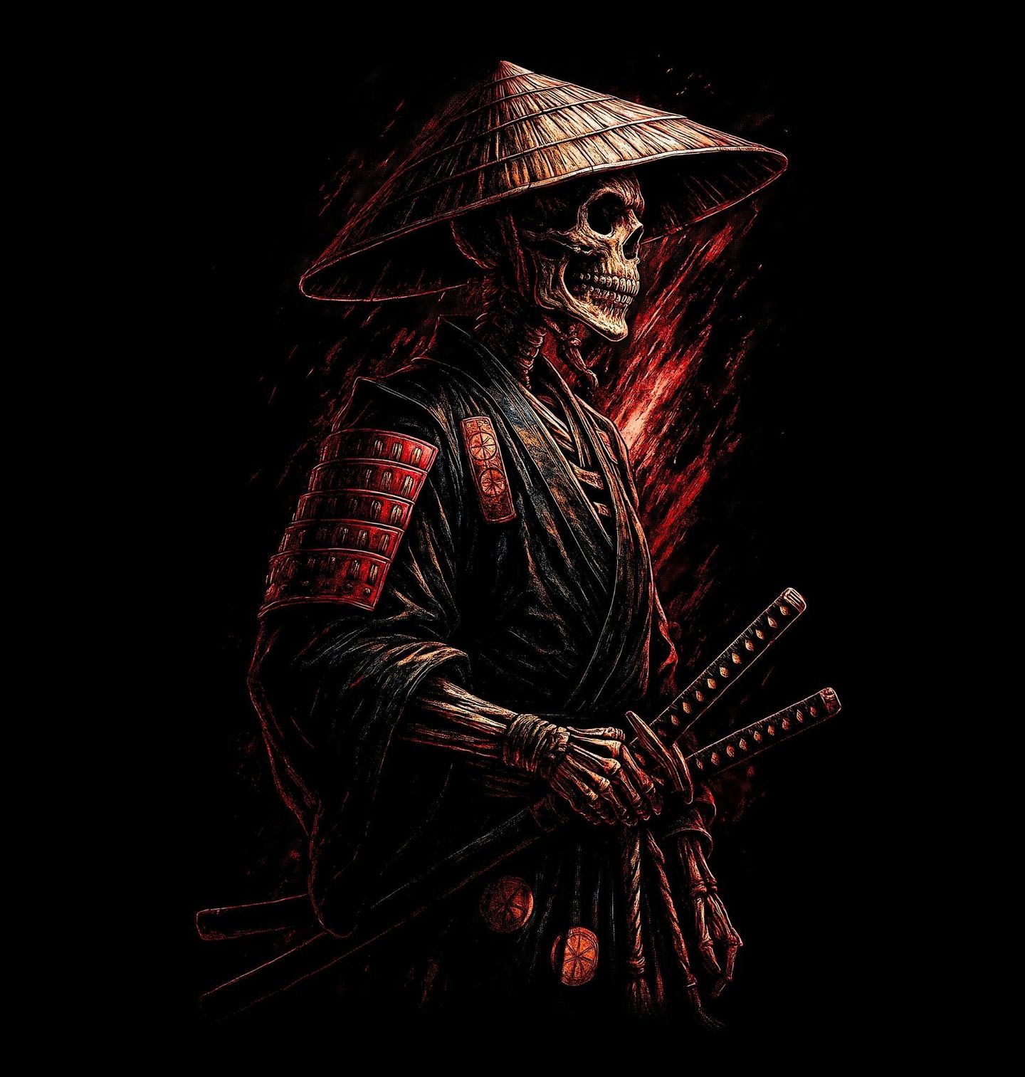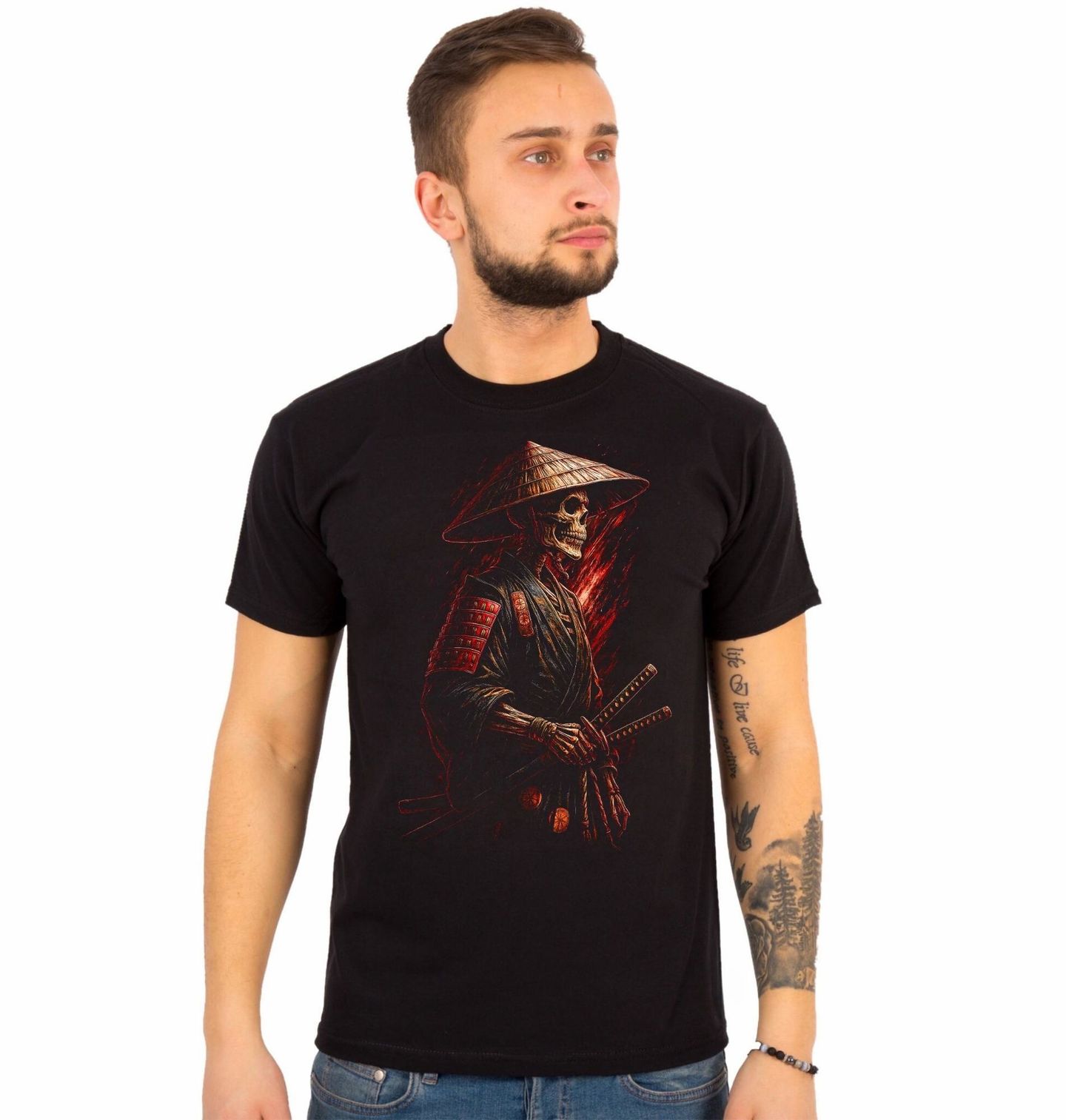 Pánské tričko Věčný Samuraj. Temný a stylově výrazný motiv inspirovaný japonskou kulturou a estetikou bojovníků. Dominantní kostlivec vystupuje jako neohrožený samuraj, zahalený do tradičního oděvu a doplněný ikonickým kloboukem. V rukou drží meče, které symbolizují čest, sílu a připravenost k boji. Detailní zpracování, dramatické barvy a silná atmosféra dělají z tohoto designu ideální volbu pro milovníky japonské tradice, fantasy i dark artu.