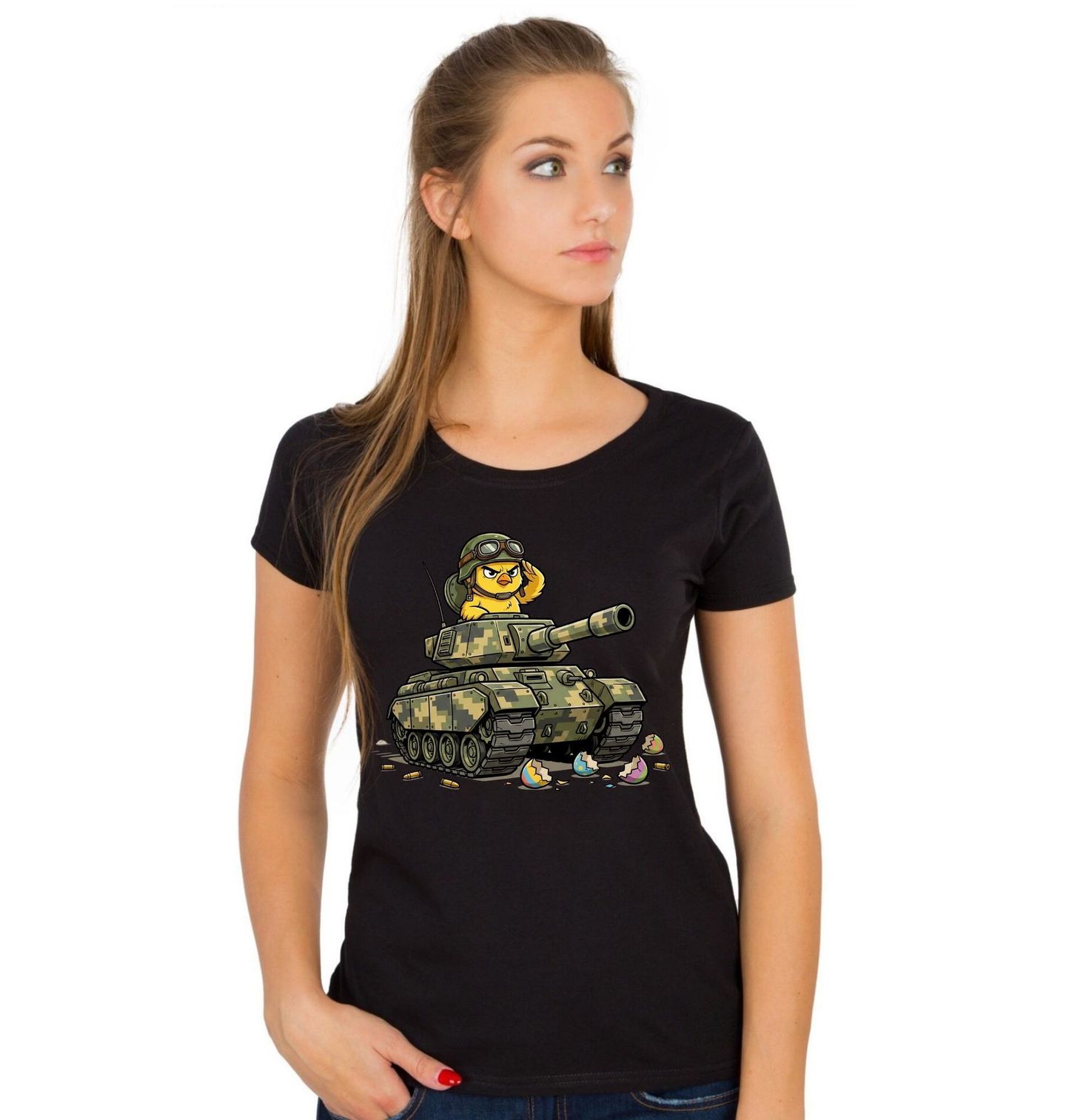 Dámské tričko Velikonoční Kuře v Tanku. Vtipný a originální motiv zobrazuje odvážné kuře, které řídí vojenský tank a s nadhledem „drtí“ velikonoční vajíčka. Tento netradiční design spojuje humor, akci a sváteční atmosféru, díky čemuž vzniká jedinečný motiv ideální pro každého, kdo má rád stylové a zábavné ilustrace. Motiv skvěle vystihuje kontrast mezi hravostí, kterou přinášejí Velikonoce, a dynamickou energií, kterou symbolizuje silný tank.