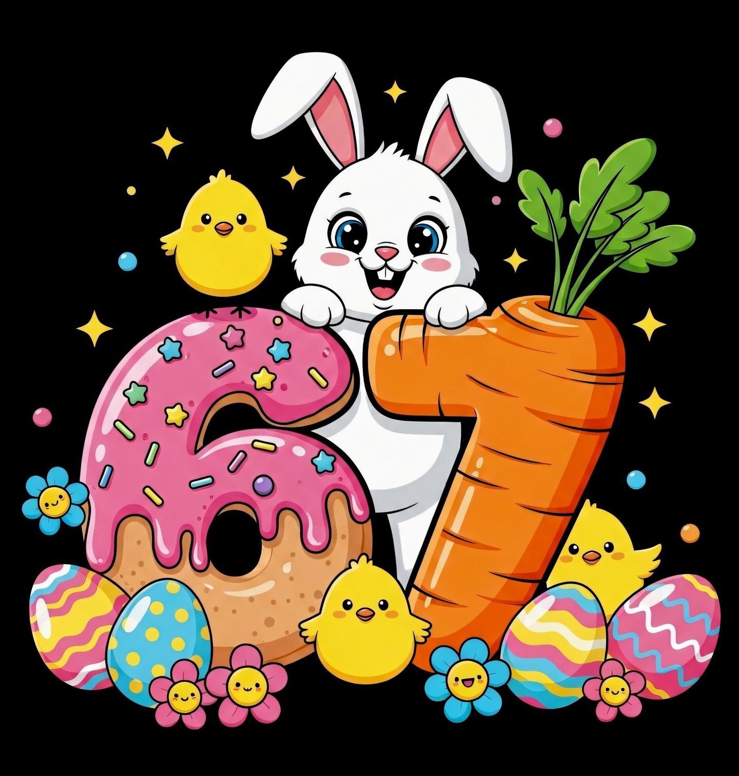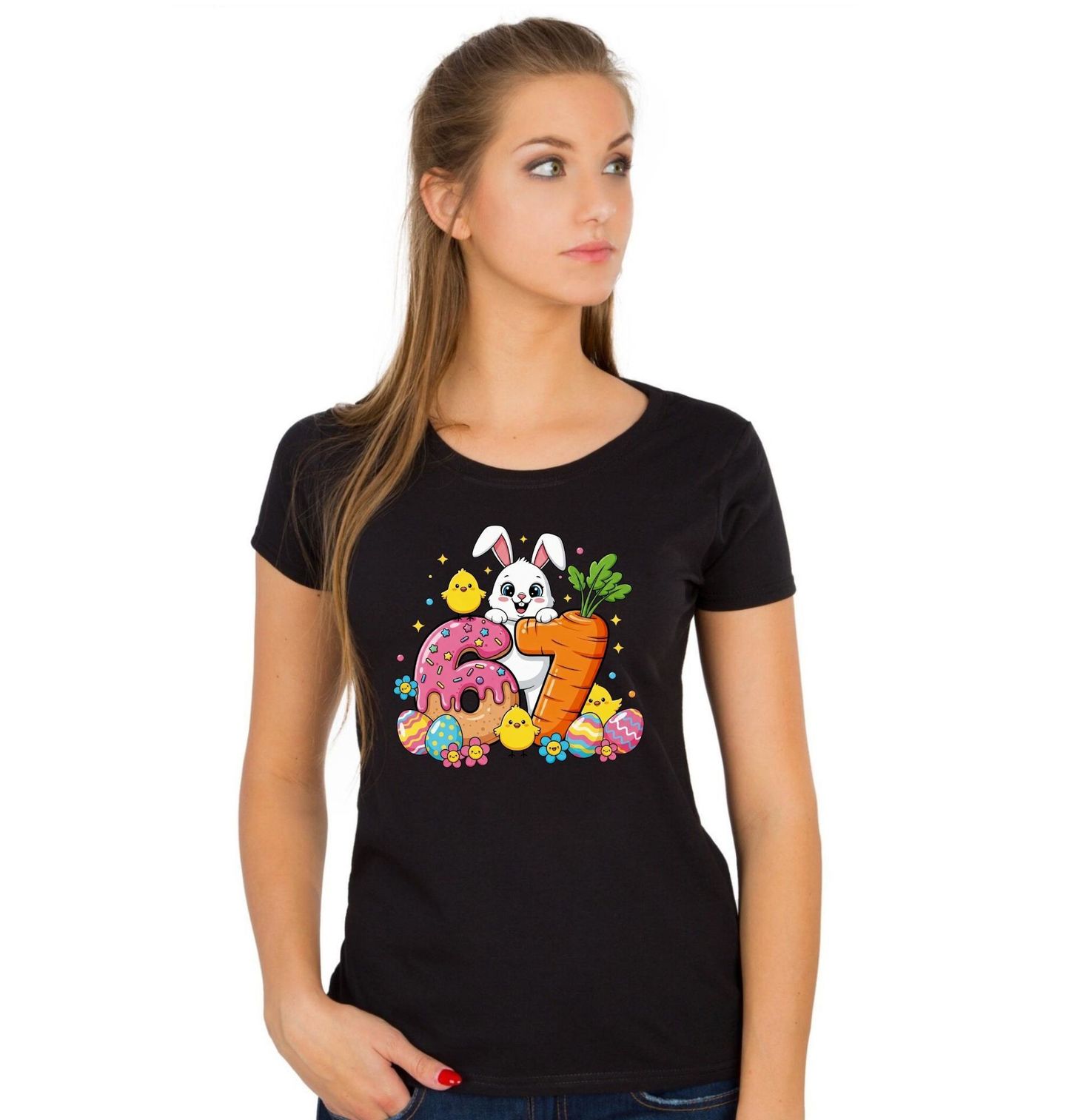 Dámské tričko Velikonoční Meme Six Seven 67. Originální a hravý motiv spojuje roztomilý králík s barevnou velikonoční atmosférou a oblíbeným stylem six seven meme. Veselá ilustrace s čísly 6 a 7, vajíčky, kuřátky a mrkví vytváří perfektní kombinaci pro oslavu i sváteční náladu. Roztomilý králík v centru motivu dodává celému obrázku pozitivní energii a dělá z něj ideální volbu na Velikonoce i jarní období.