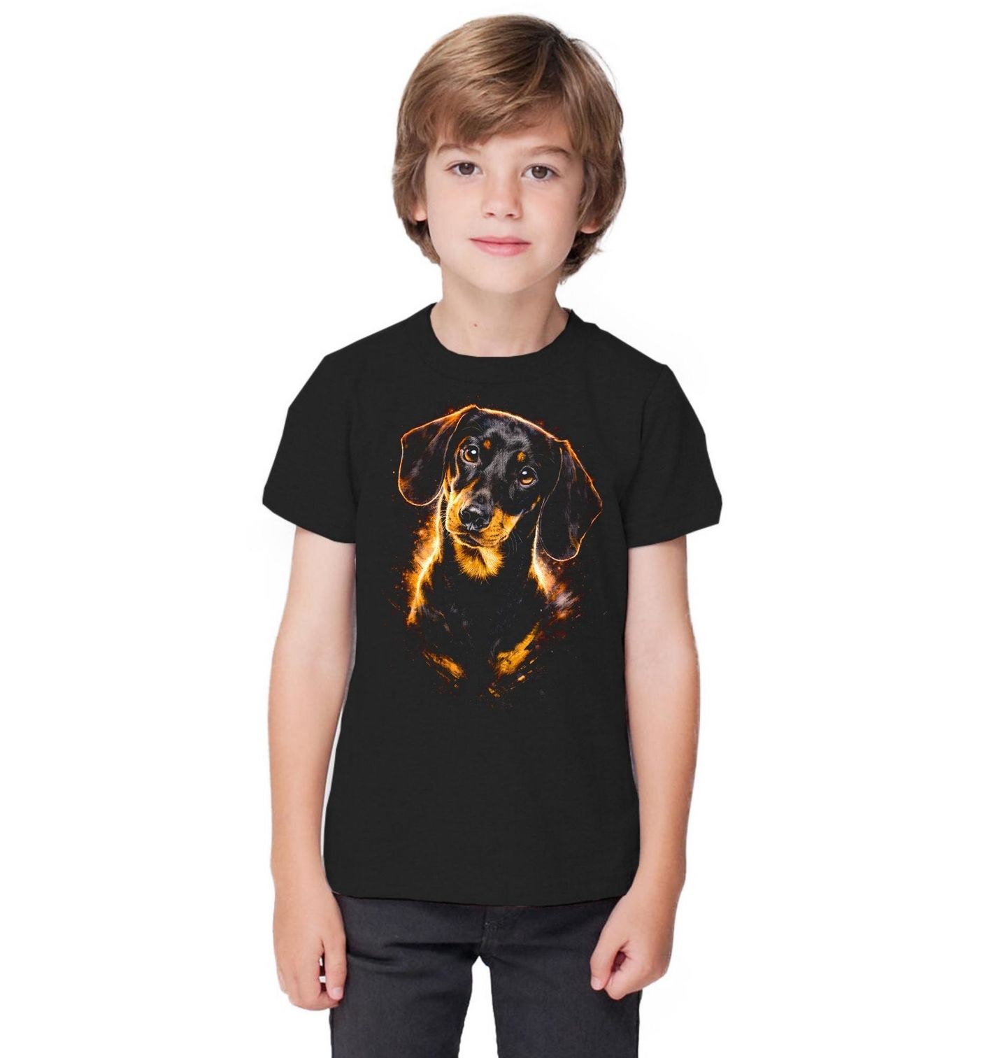Dětské tričko Věrný Pohled Jezevčíka. Roztomilý a hravý motiv, který dokonale vystihuje jedinečné kouzlo plemene jezevčík. Tento ikonický pes s dlouhým tělem a krátkými nožkami si získal srdce mnoha lidí svou odvahou, chytrostí a osobitým stylem. Každý pejskař ocení design, který zachycuje jeho nezaměnitelný vzhled i temperament.