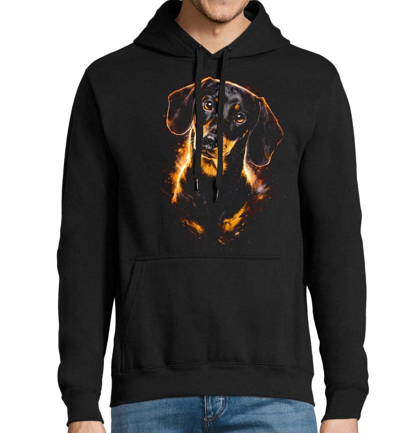 Pánská mikina Věrný Pohled Jezevčíka. Roztomilý a hravý motiv, který dokonale vystihuje jedinečné kouzlo plemene jezevčík. Tento ikonický pes s dlouhým tělem a krátkými nožkami si získal srdce mnoha lidí svou odvahou, chytrostí a osobitým stylem. Každý pejskař ocení design, který zachycuje jeho nezaměnitelný vzhled i temperament.