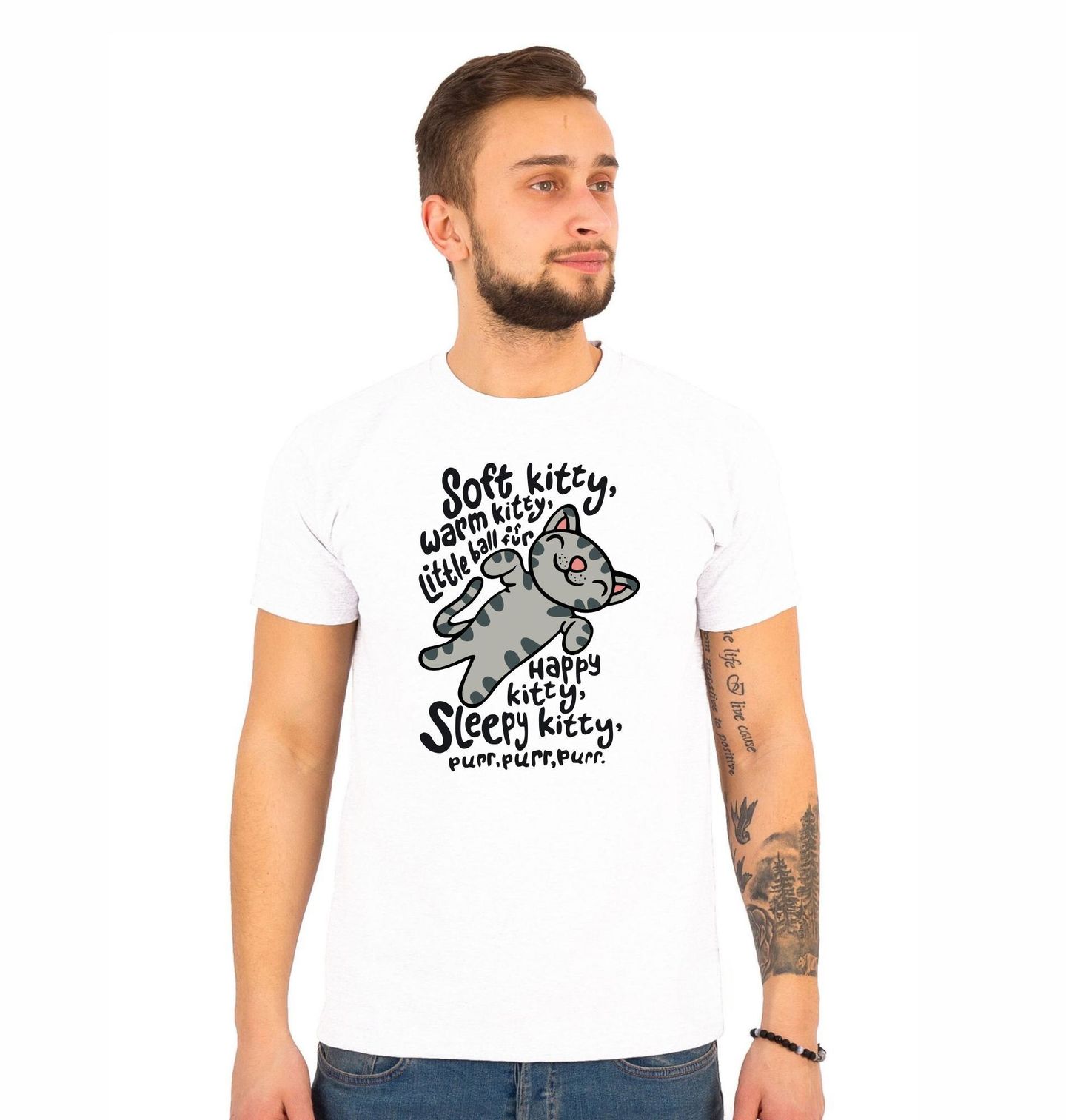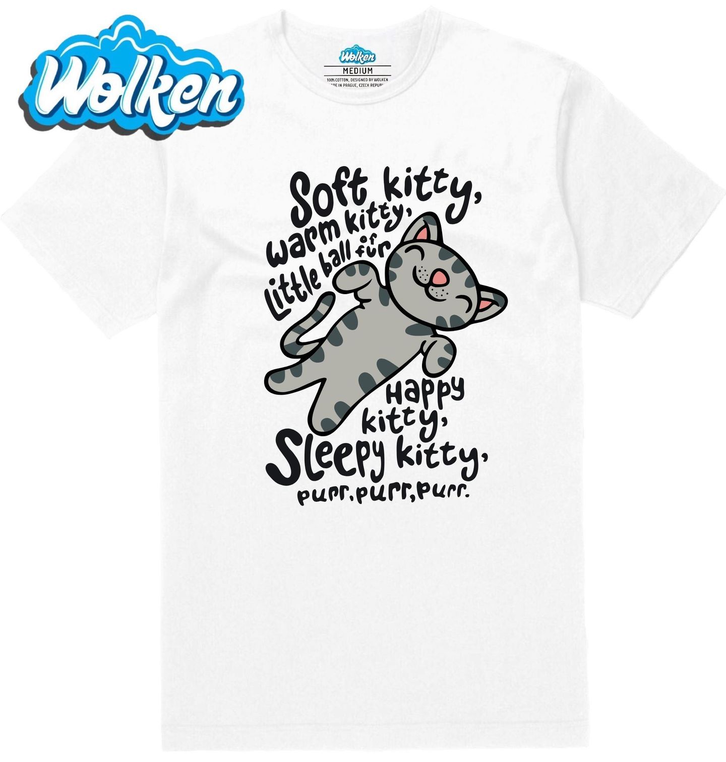 Pánské tričko Veselá kočka, která nemá nikdy dost! Soft kitty, warm kitty, little ball of fur happy kitty, sleepy kitty, purr, purr, purr. Jemná kočka, hřejivá kočka, malá koule chlupů šťastná kočička, ospalá kočička, vrr, vrr, vrrr.