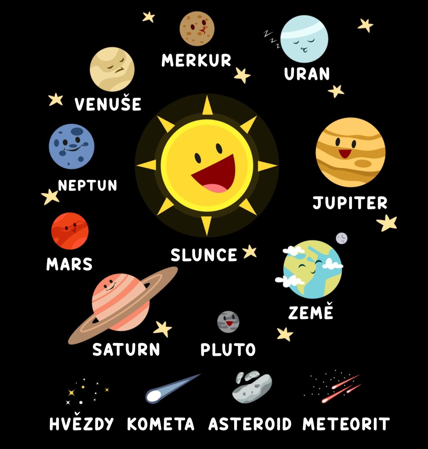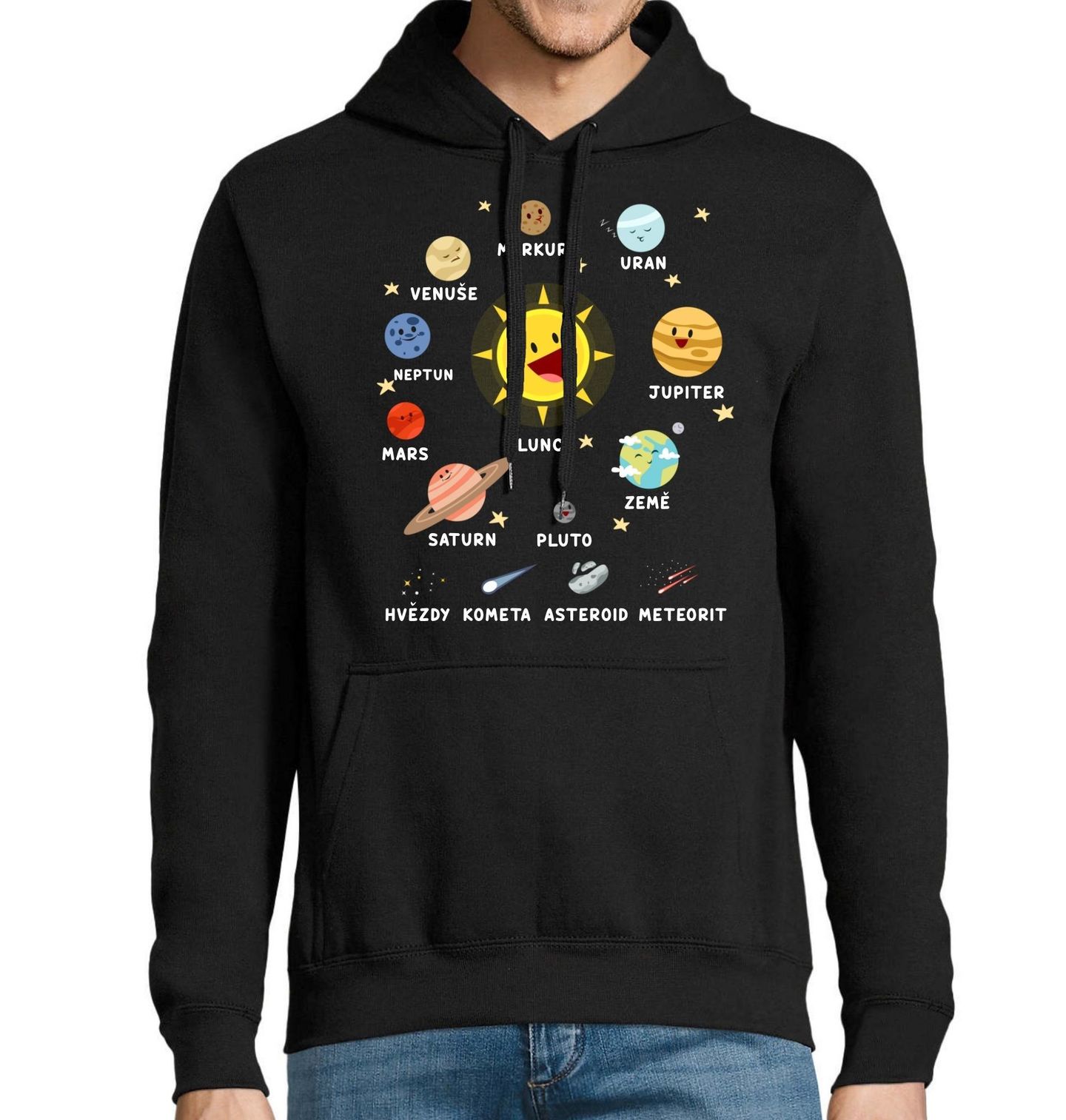 Pánská mikina Veselá Sluneční Soustava. Roztomilý motiv s veselými planetami a usměvavým Sluncem je ideální pro malé objevitele vesmíru. Barevné ilustrace s obličeji zaujmou děti na první pohled a hravou formou je naučí poznávat planety. Na motivu najdeš: Merkur, Venuši, Zemi, Mars, Jupiter, Saturn, Uran, Neptun a Pluto, Slunce, hvězdy, kometa, asteroid a meteorit.