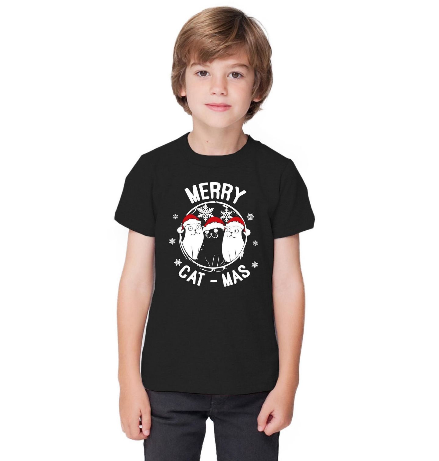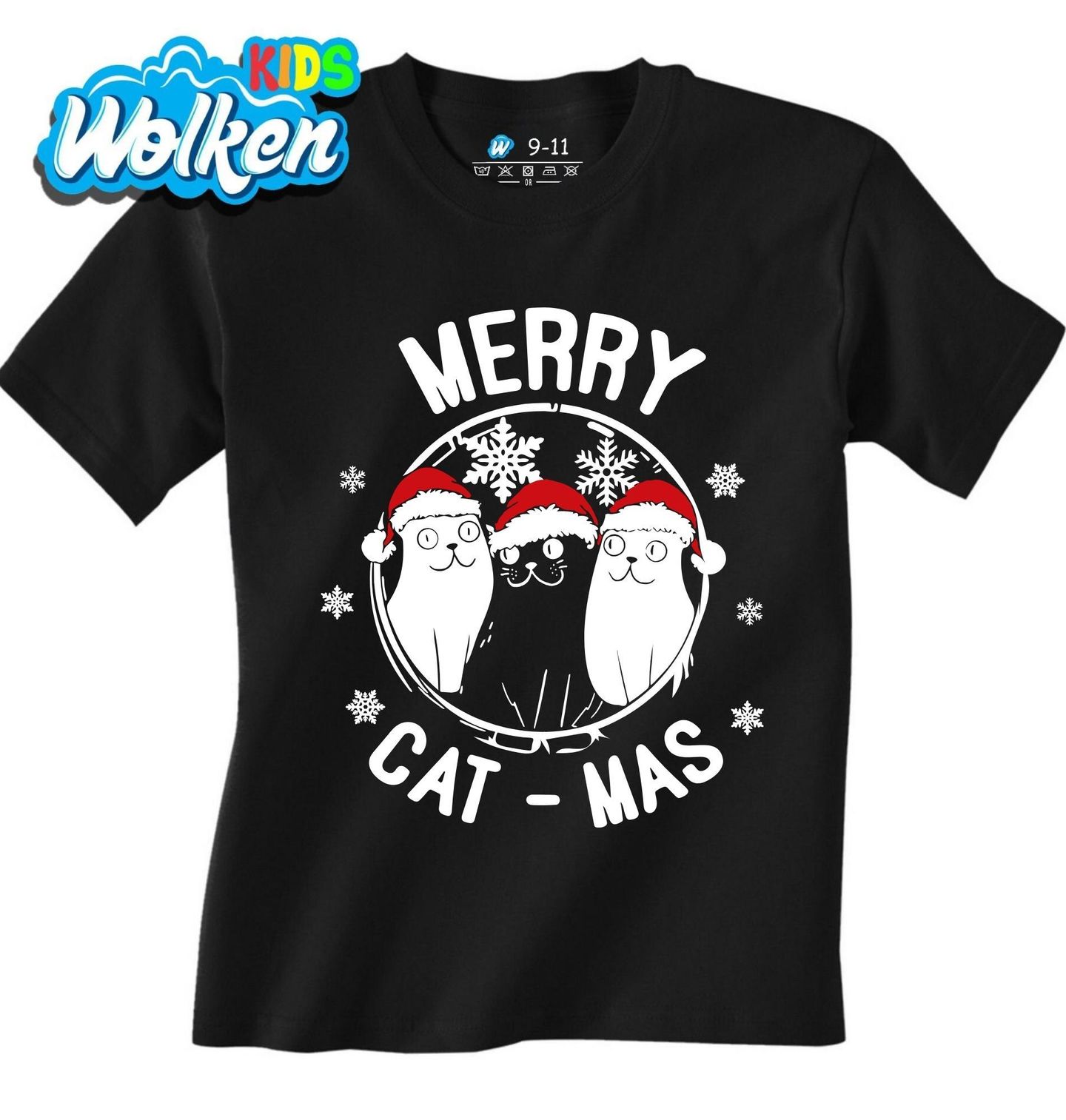 Dětské tričko Veselé Kočičí Vánoce Merry Cat-mas. Roztomilý motiv „Merry Cat-mas“ je ideální pro všechny milovníky koček a vánoční pohody. Tři kočky v Santovských čepicích, doplněné o vločky, vám zaručeně vykouzlí úsměv na tváři. Tento originální design propojuje Vánoce s láskou a kočkami.