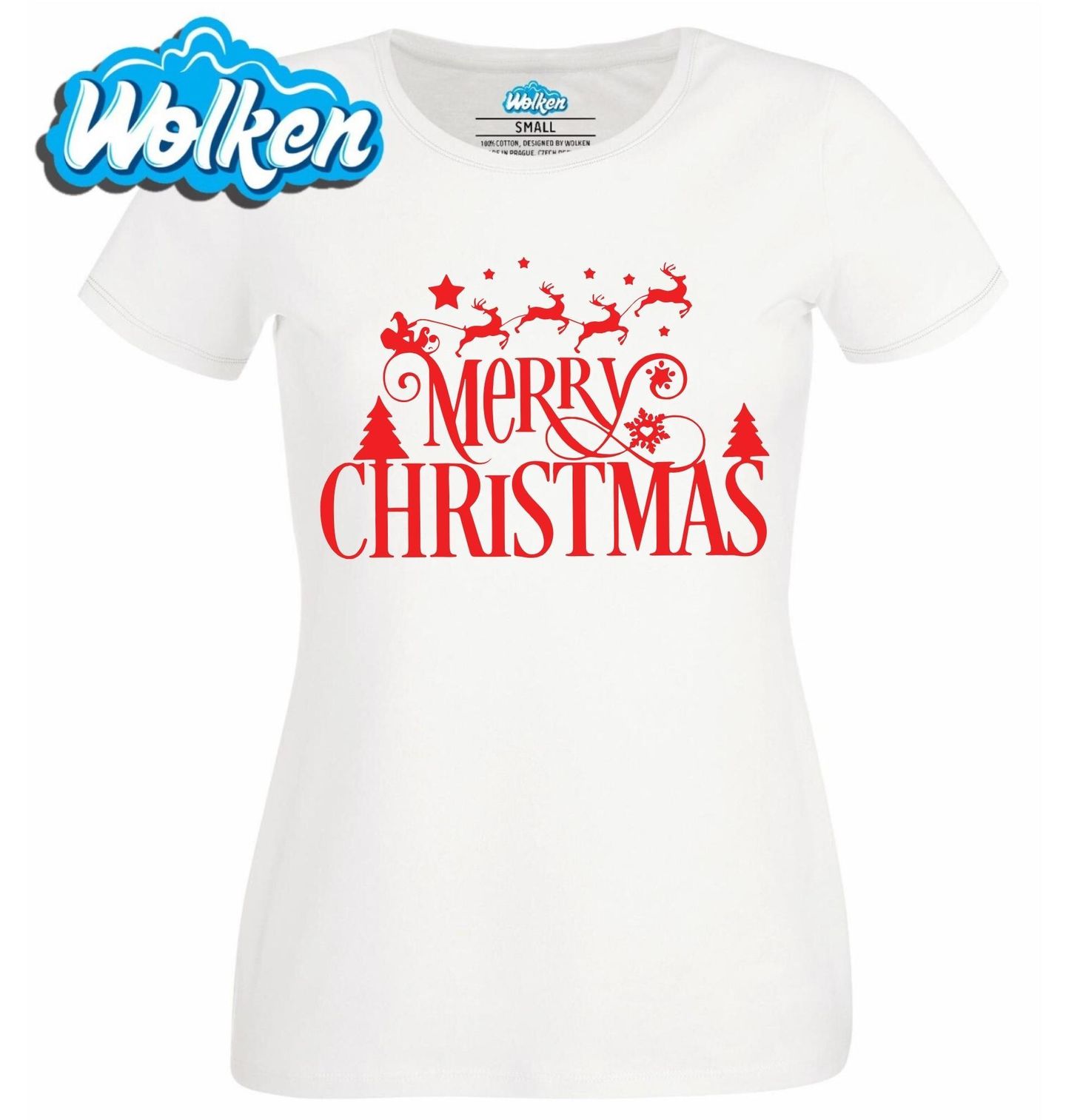 Dámské tričko Veselé Santovy Vánoce Merry Christmas. Elegantní motiv Merry Christmas je ideální volbou pro všechny, kteří chtějí oslavit Vánoce tradičně a stylově. Design zobrazuje ikonický nápis Merry Christmas (Veselé Vánoce) doplněný o siluetu Santu na saních tažených soby, vánoční stromečky, hvězdičky a vločku.