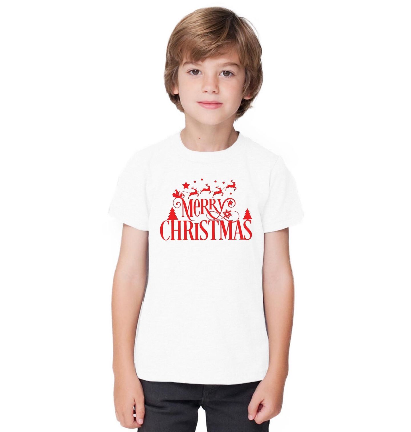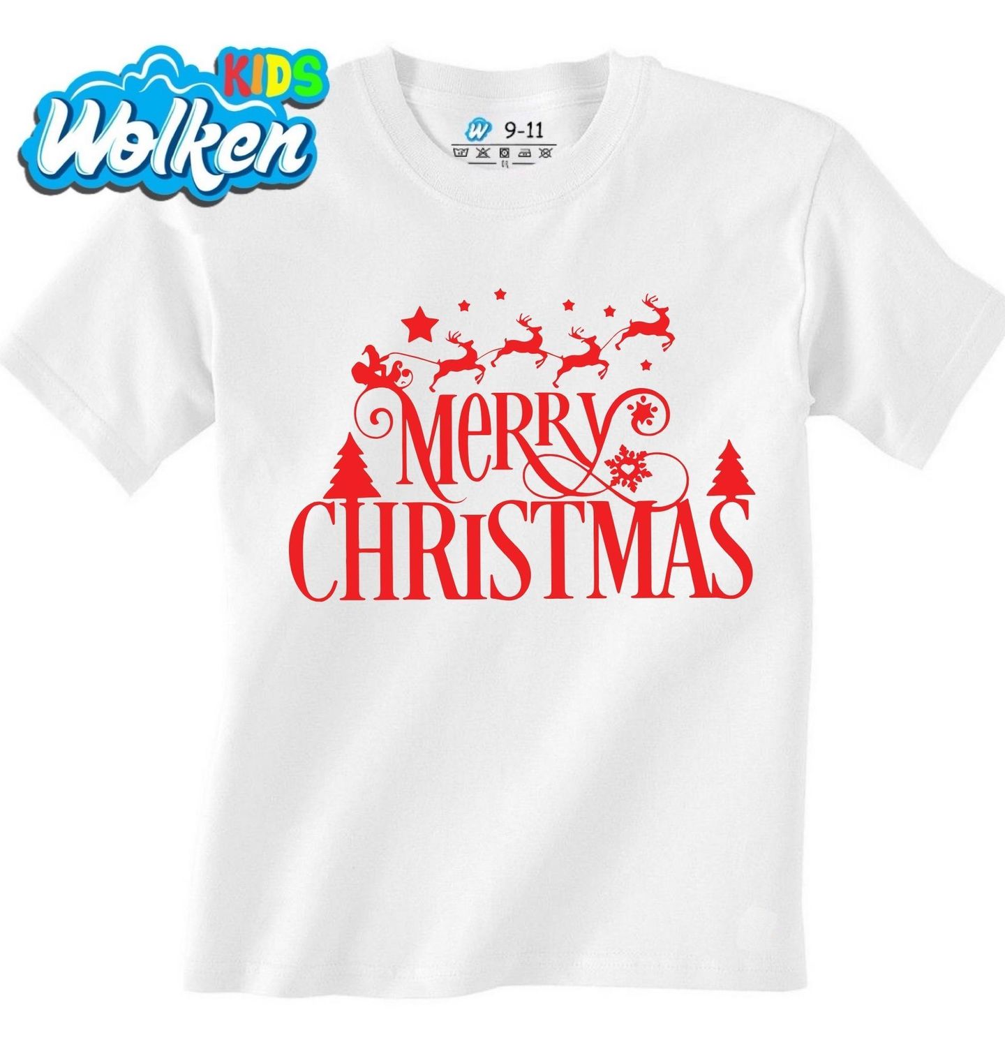 Dětské tričko Veselé Santovy Vánoce Merry Christmas. Elegantní motiv Merry Christmas je ideální volbou pro všechny, kteří chtějí oslavit Vánoce tradičně a stylově. Design zobrazuje ikonický nápis Merry Christmas (Veselé Vánoce) doplněný o siluetu Santu na saních tažených soby, vánoční stromečky, hvězdičky a vločku.