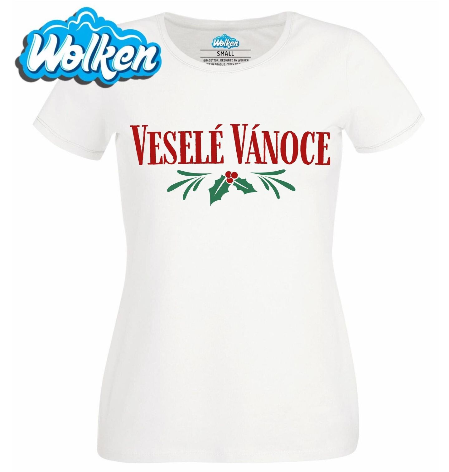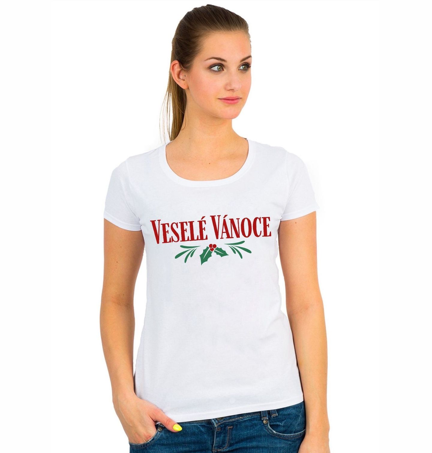 Dámské tričko Veselé Vánoce. Vánoce – svátky klidu, pohody a tradic. Tento motiv s výrazným nápisem „Veselé Vánoce“ v klasické červené barvě doplněný o zelené větvičky cesmíny v sobě nese vše, co milujeme na sváteční atmosféře. Čistý, elegantní a přitom nostalgický design připomíná staré vánoční pohlednice.