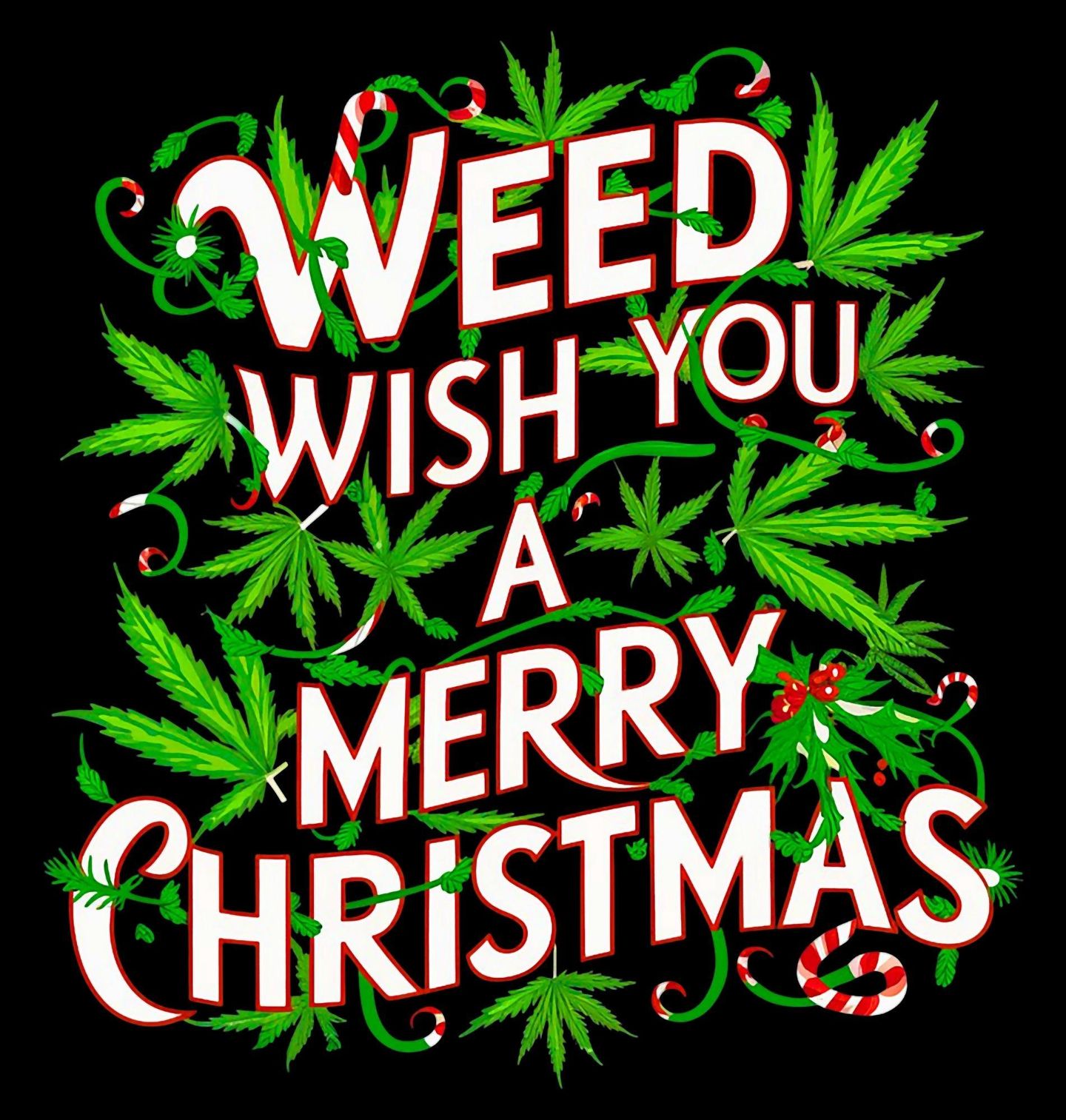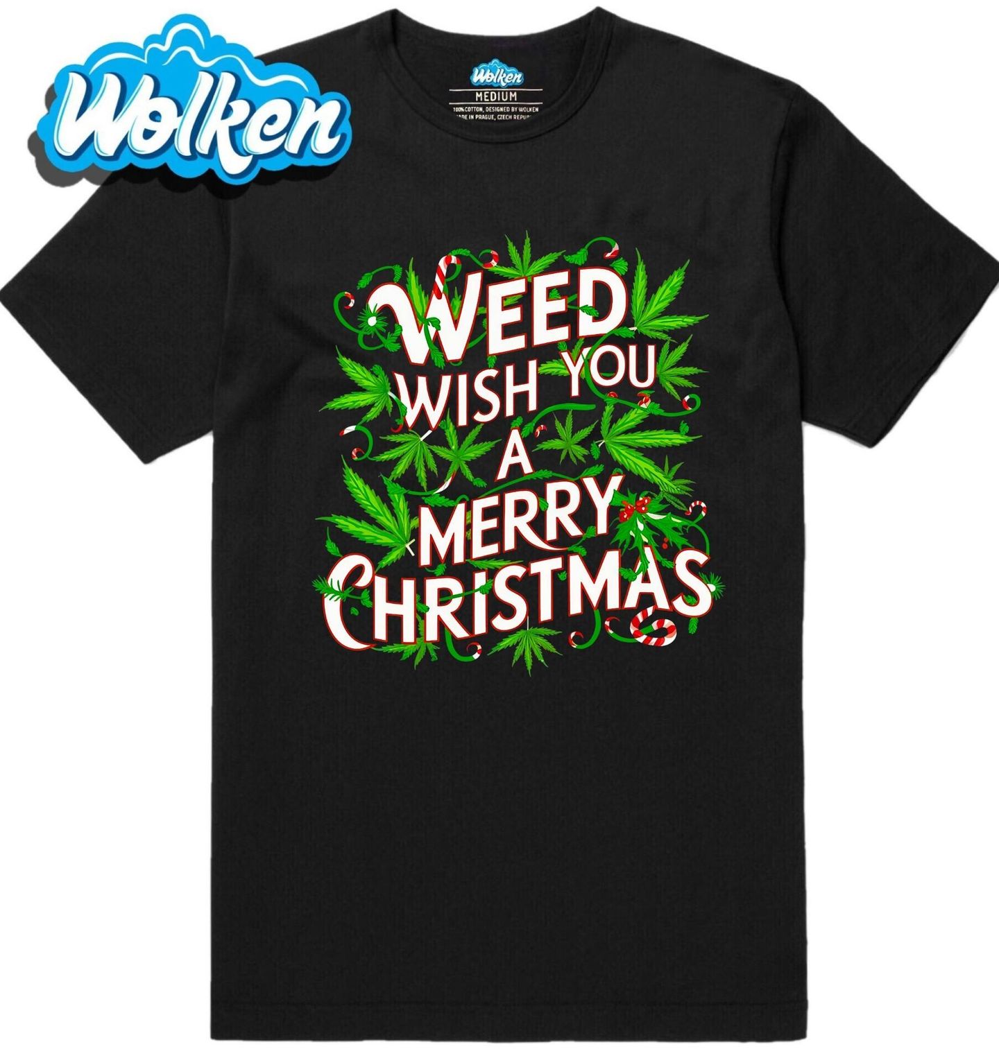 Pánské tričko Veselé Vánoce plné Trávy. Oslavte Vánoce jinak – s motivem, kde hraje hlavní roli tráva a marihuana. Design „Weed Wish You a Merry Christmas“ spojuje klasické sváteční prvky jako ozdoby a cukrové hůlky s listy marihuany, které dodávají motivu odlehčený a rebelsky laděný styl.