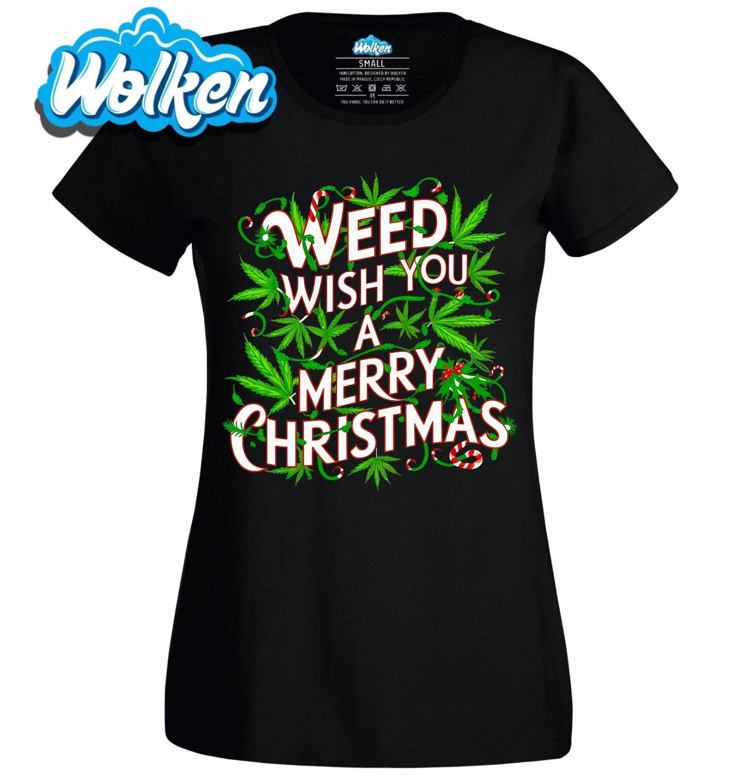 Dámské tričko Veselé Vánoce plné Trávy. Oslavte Vánoce jinak – s motivem, kde hraje hlavní roli tráva a marihuana. Design „Weed Wish You a Merry Christmas“ spojuje klasické sváteční prvky jako ozdoby a cukrové hůlky s listy marihuany, které dodávají motivu odlehčený a rebelsky laděný styl.