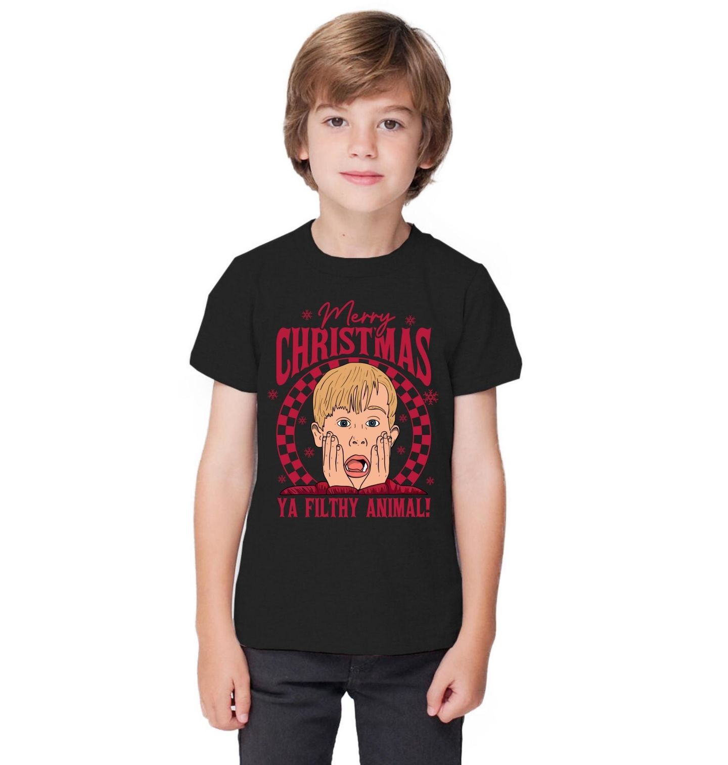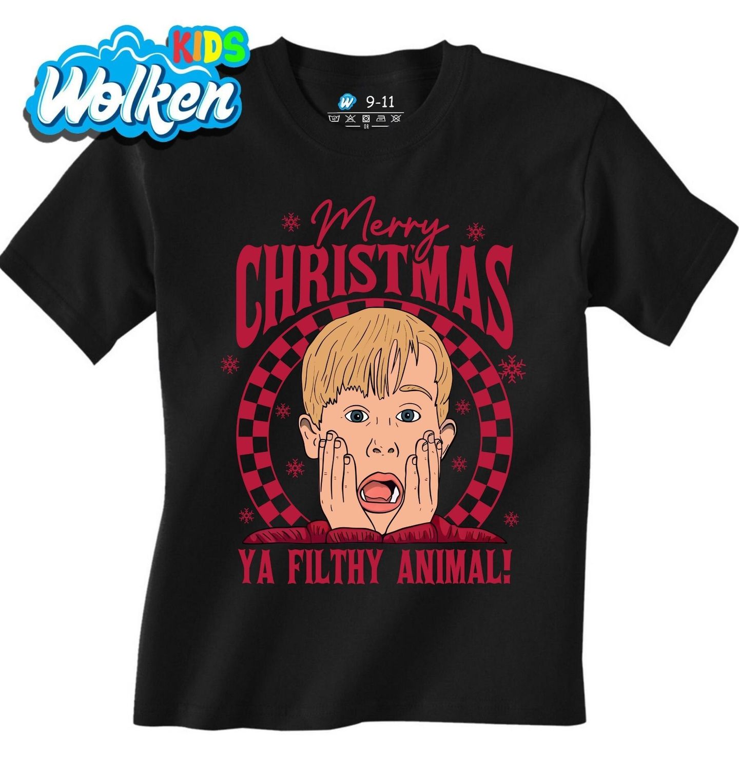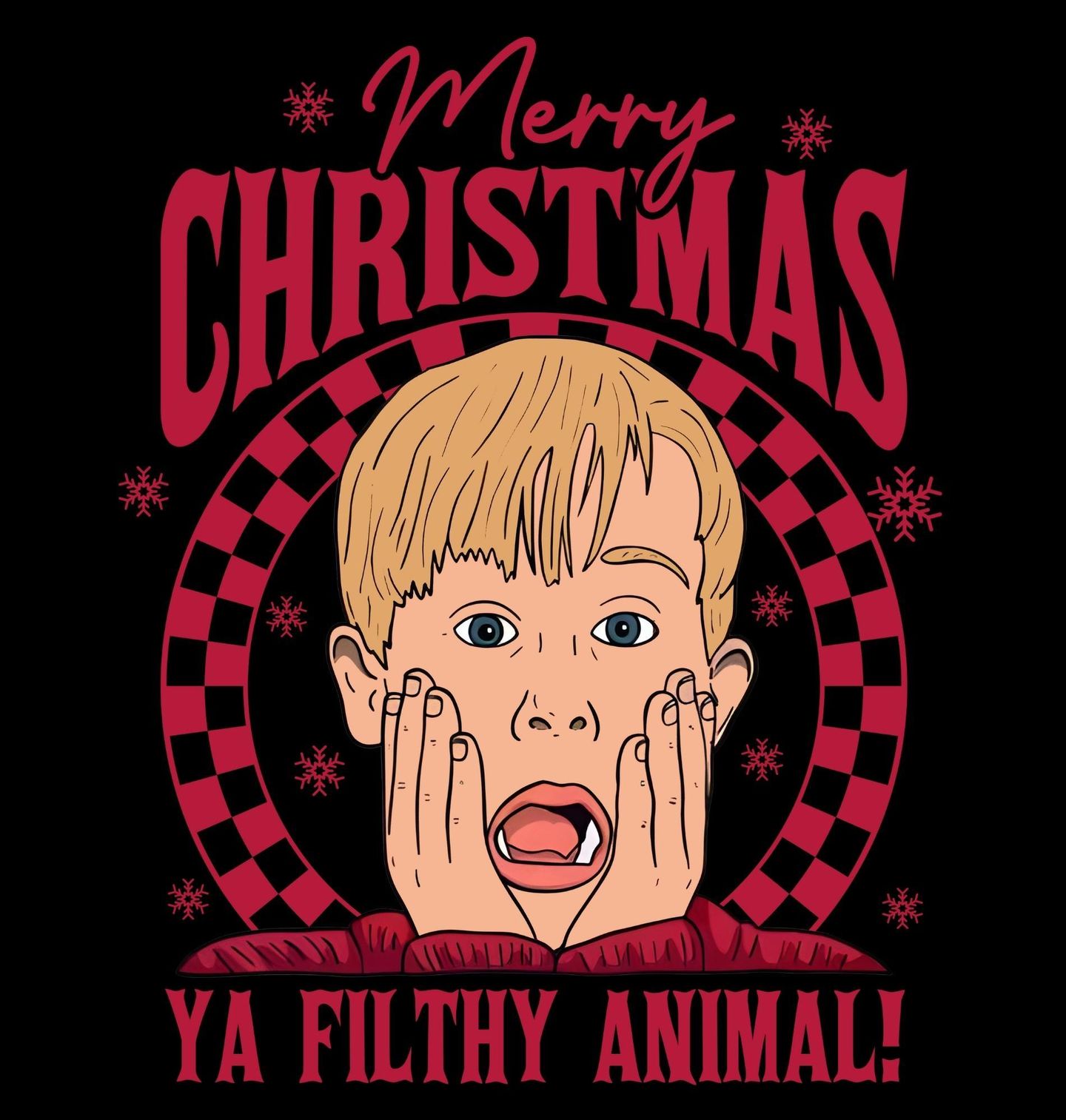 Dětské tričko Veselé Vánoce, ty špinavé zvíře Sám doma. Silueta malého Kevina a hláška „Merry Christmas, ya filthy animal“ (česky: „Veselé Vánoce, ty špinavé zvíře“) okamžitě navodí nostalgickou atmosféru rodinného filmu Sám doma. Pro každého, kdo miluje Vánoce s pořádnou dávkou nostalgie a humoru.