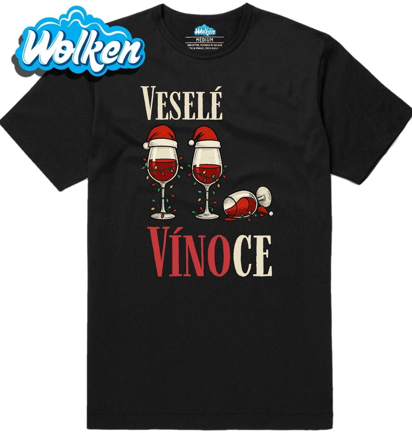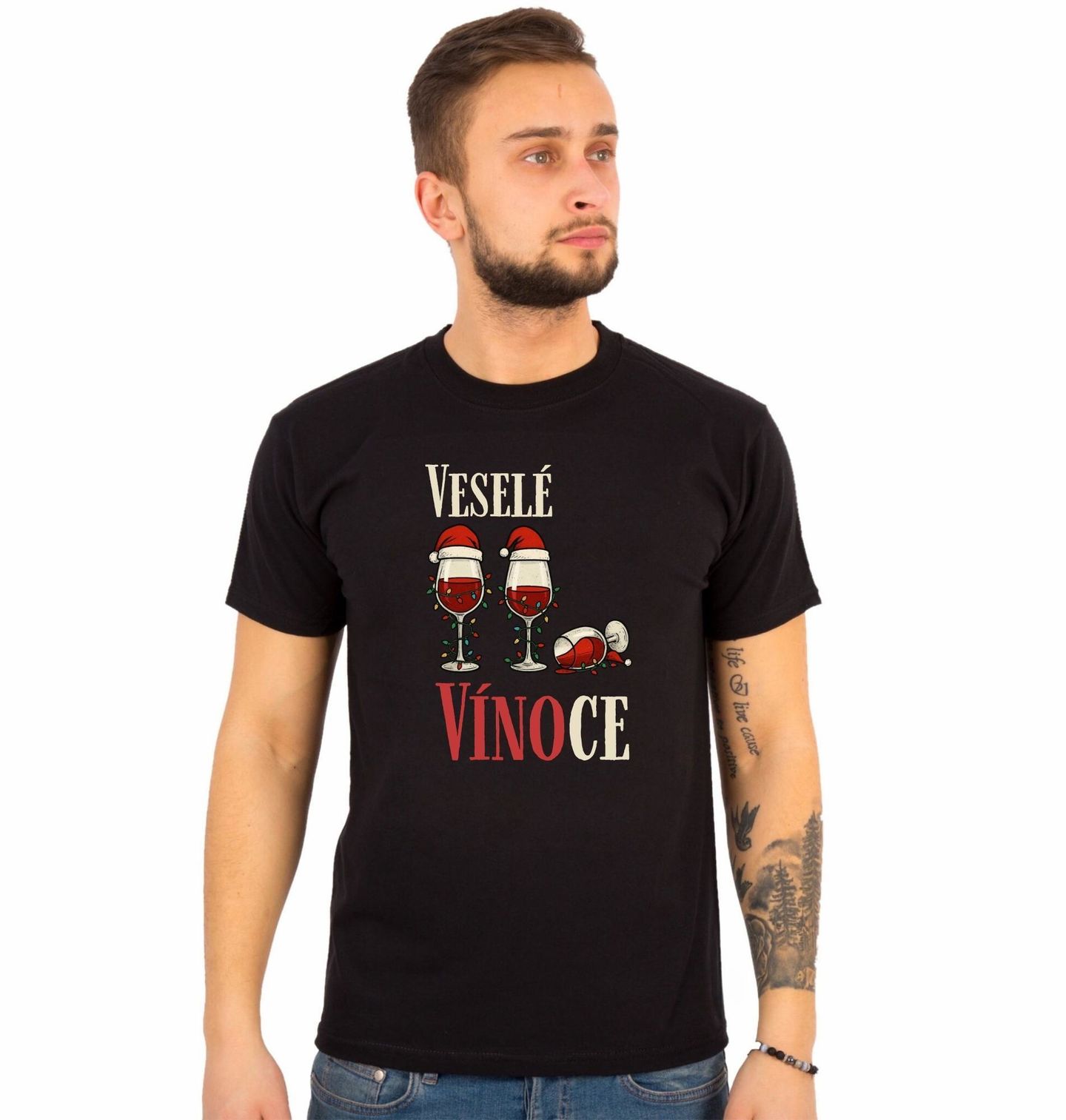 Pánské tričko Veselé Vínoce. Vtipný motiv s nápisem „Veselé Vínoce“ je ideální pro všechny milovníky vína, kteří chtějí slavit Vánoce po svém – s humorem a sklenkou v ruce. Tři skleničky s červeným vínem, vánočními čepičkami a světýlky dokonale vystihují atmosféru svátečního pohody.