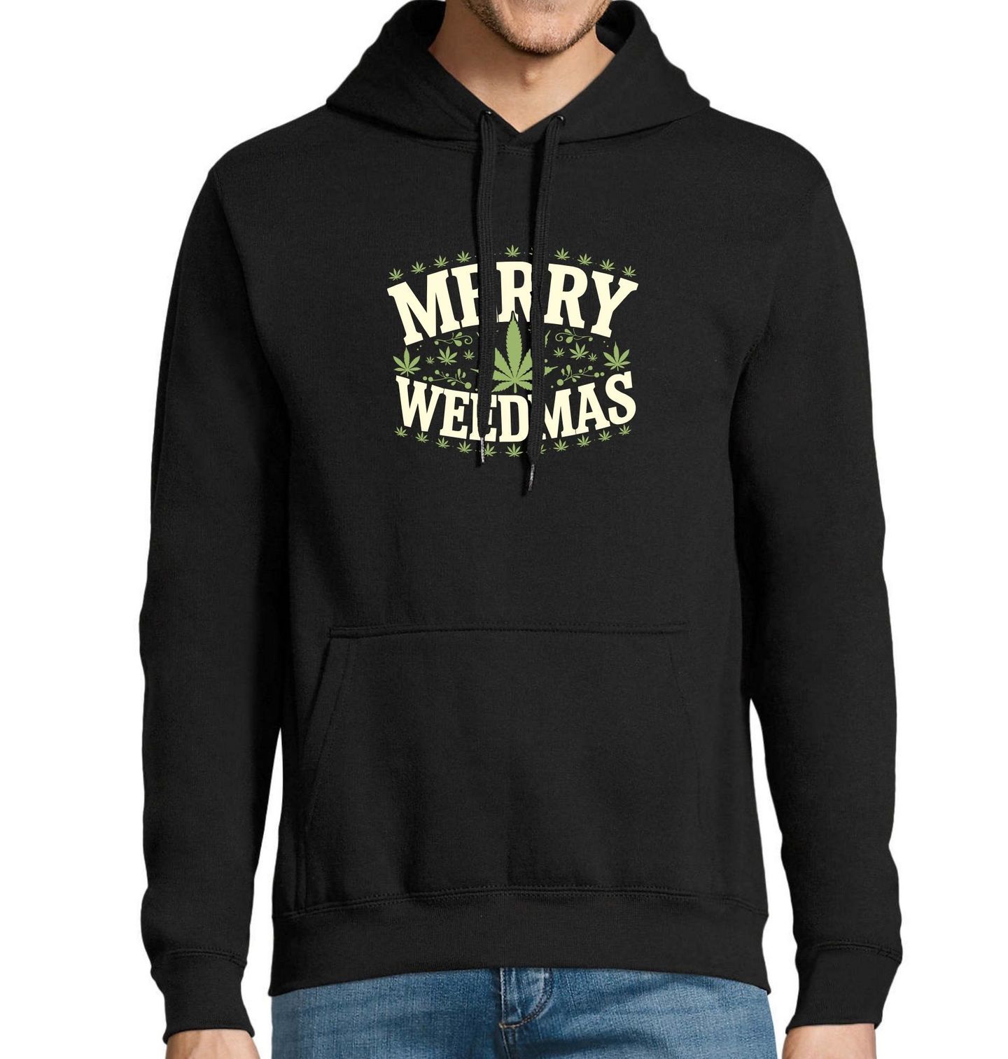 Pánská mikina Veselé Zhulené Vánoce Merry Weedmas. Merry Christmas (Veselé Vánoce) + weed (tráva/marihuana). Vánoce už dávno nejsou jen o cukroví a kaprovi – přichází Merry Weedmas! Tento vtipný motiv spojuje sváteční atmosféru s konopnou kulturou, a to s pořádnou dávkou nadhledu.
