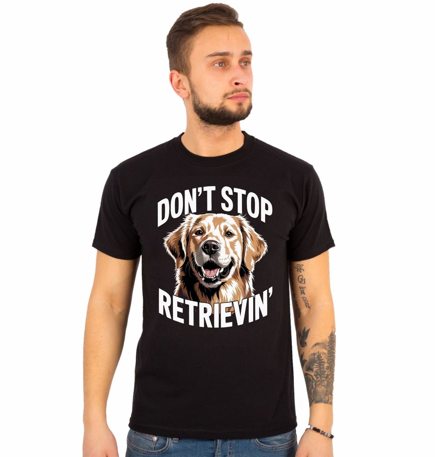 Pánské tričko Veselý Retrívr Don’t Stop Retrievin’. Vtipný motiv zobrazuje šťastného psa plemene retrívr s nápisem „Don’t Stop Retrievin’“, což je slovní hříčka inspirovaná známou frází „Don’t stop believing“. Překlad může znít „Nikdy nepřestávej aportovat“. Design vystihuje radostnou povahu psa, jeho hravost a nekonečnou energii, kterou milují všichni majitelé tohoto oblíbeného plemene.