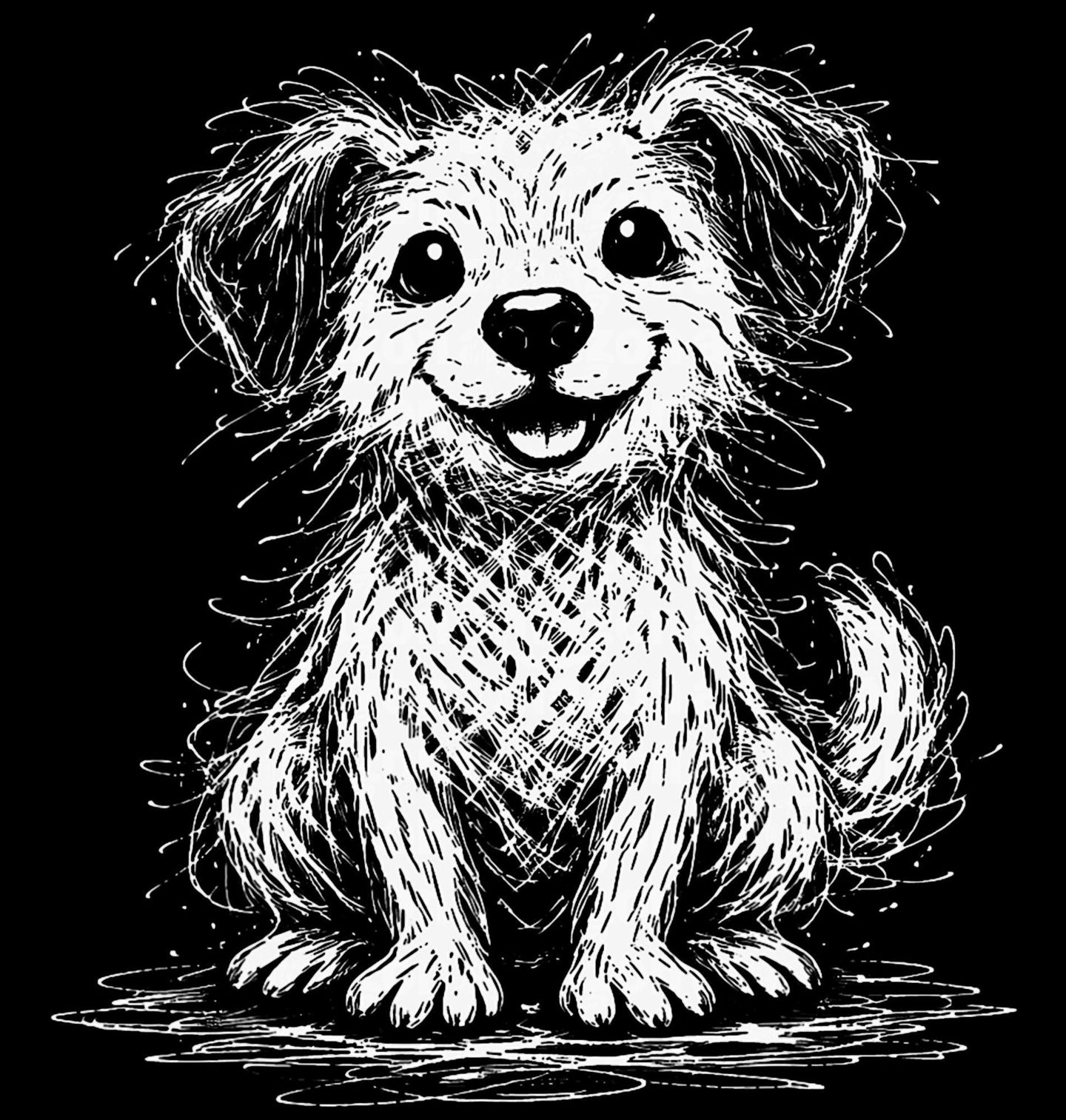Pánské tričko Veselý Štěněčí Úsměv Skica. Tento hravý motiv zachycuje malého pejska v jednoduchém, ručně kresleném stylu, který okamžitě zaujme svou roztomilostí a výrazem radosti. Jemné linie a kontrast černé a bílé dodávají ilustraci jedinečný charakter, díky kterému pes působí živě a přátelsky. Ideální design pro milovníky psů.