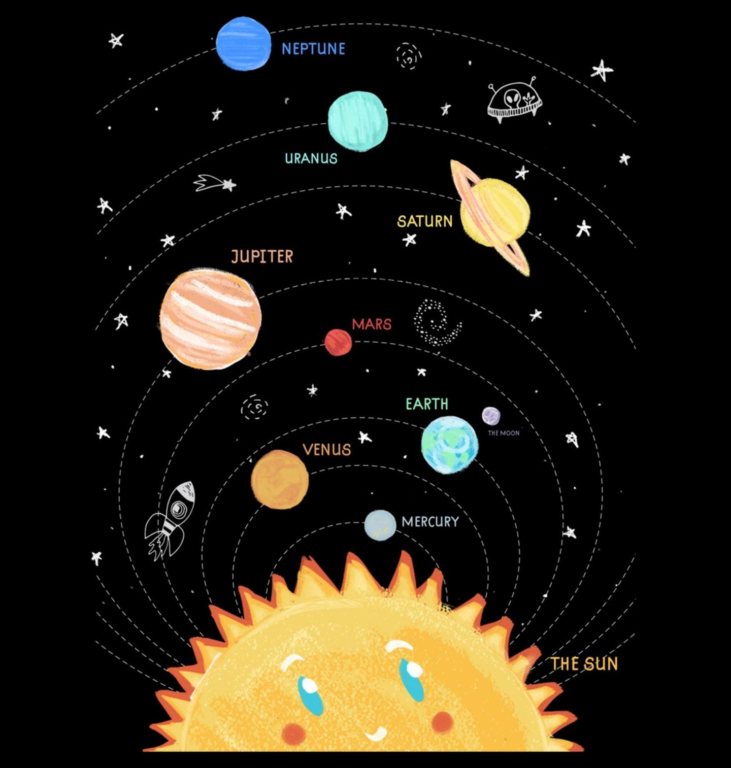 Pánské tričko Vesmír kolem Nás. Motiv zobrazuje sluneční soustavu s jednotlivými planetami, jejich názvy a oběžnými drahami kolem Slunce. Přehledné a zároveň hravé zpracování dělá z tohoto designu ideální doplněk pro všechny milovníky vesmíru a astronomie. Motiv zobrazuje Merkur, Venuše, Země, Mars, Jupiter, Saturn, Uran, Neptun (včetně Měsíce a Slunce).