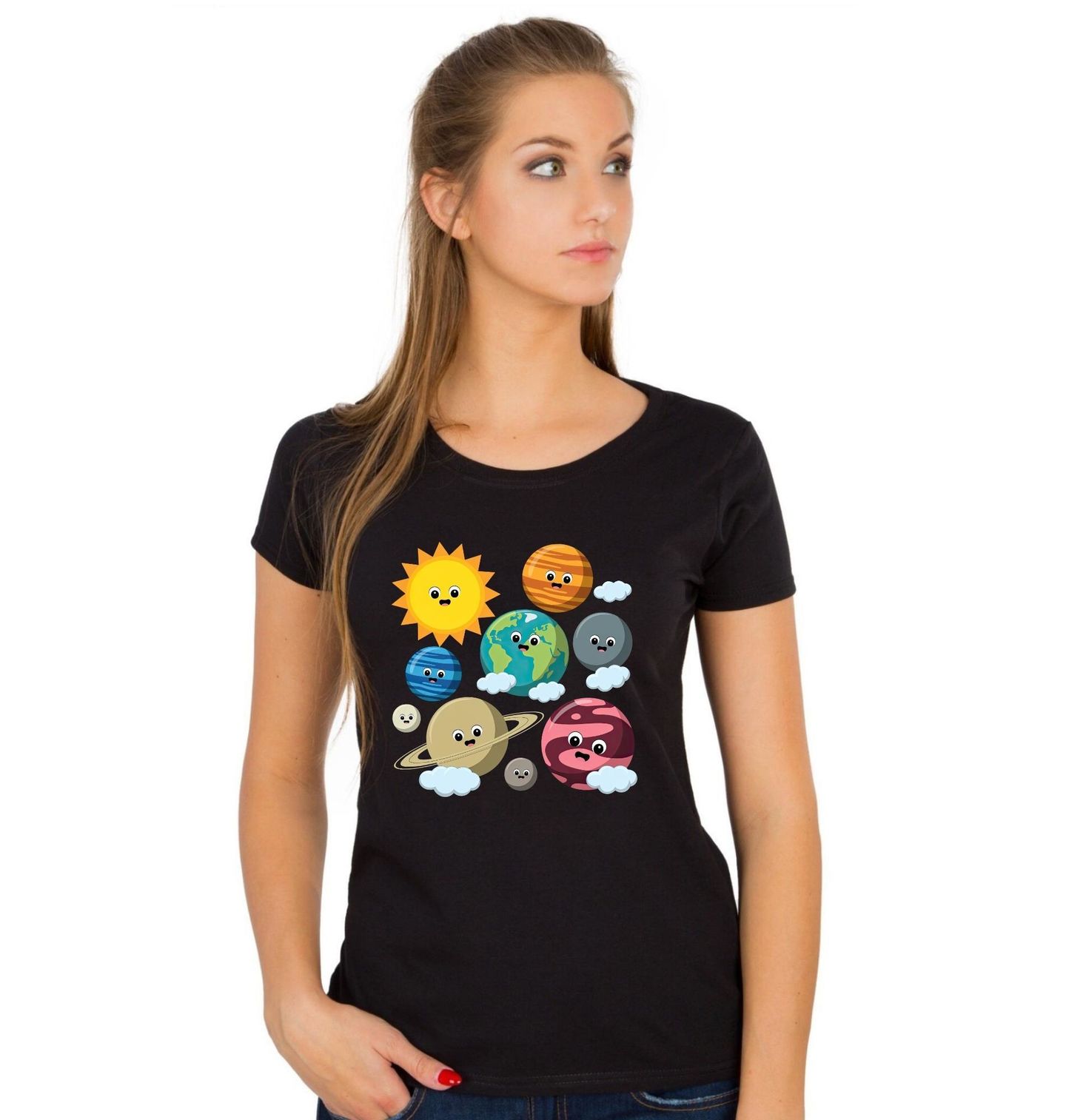Dámské tričko Vesmír Roztomilých Planet. Barevný a hravý motiv, ve kterém se usmívá celý vesmír! Na obrázku jsou roztomilé planety i naše Slunce – konkrétně Merkur, Venuše, Země, Mars, Jupiter, Saturn, Uran a Neptun. Každá planeta má veselý výraz a kolem nich poletují malé mráčky, takže celý vesmír působí přátelsky a pozitivně.