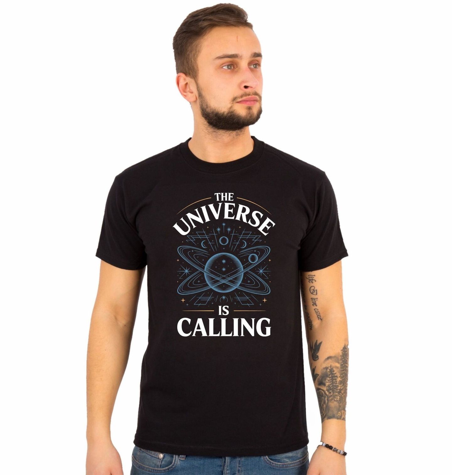 Pánské tričko Vesmír volá The Universe Is Calling. Stylový design pro všechny, které fascinuje vesmír, planety a nekonečné hvězdy. Motiv s minimalistickou ilustrací planetárních drah a kosmických symbolů působí moderně a tajemně zároveň. Vesmír zde symbolizuje dobrodružství, objevování i touhu poznávat nové světy.