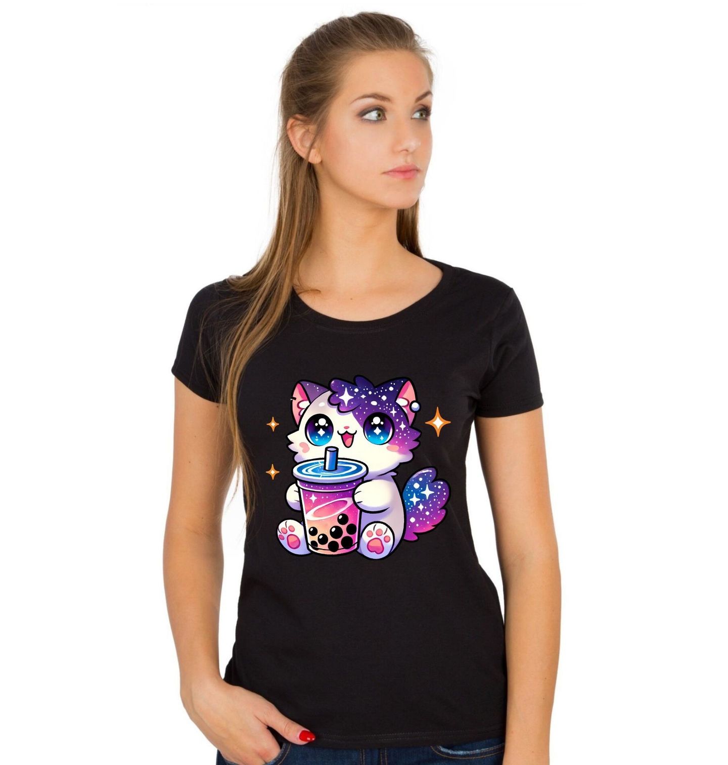 Dámské tričko Vesmírná Kočka s Bubble Tea. Usměvavá kočka s hvězdným kožíškem drží oblíbený nápoj bubble tea s perlami. Ideální pro milovníky sladkostí, kawaii stylu a zábavných, barevných motivů. Bubble tea v kombinaci s vesmírem a zvířátky vytváří unikátní spojení, které osloví fanoušky anime, Japonska i pastelových snů.