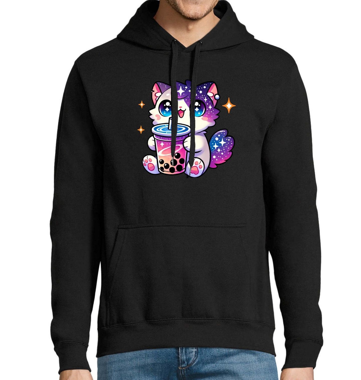 Pánská mikina Vesmírná Kočka s Bubble Tea. Usměvavá kočka s hvězdným kožíškem drží oblíbený nápoj bubble tea s perlami. Ideální pro milovníky sladkostí, kawaii stylu a zábavných, barevných motivů. Bubble tea v kombinaci s vesmírem a zvířátky vytváří unikátní spojení, které osloví fanoušky anime, Japonska i pastelových snů.