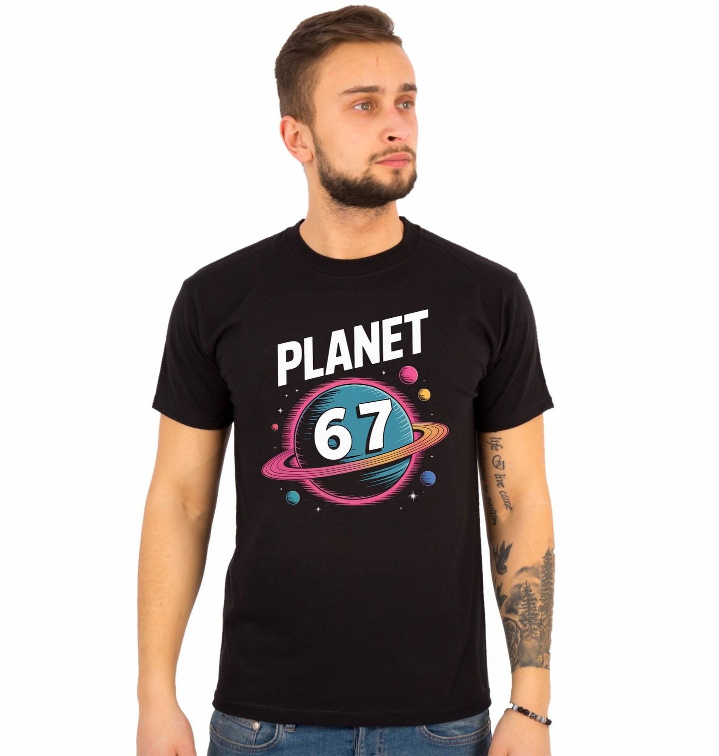 Pánské tričko Vesmírná Planeta 67 Six Seven. Objev svůj vlastní vesmír s motivem Planeta 67! Stylové a vtipné tričko inspirované fenoménem six seven přináší barevnou retro ilustraci, kde dominuje číslo 67 uprostřed galaxie. Ideální pro fanoušky internetové kultury, protože tenhle design je čisté meme jak z jiné dimenze.