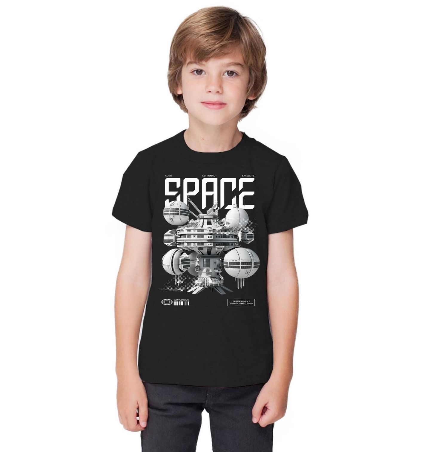 Dětské tričko Vesmírná Stanice Space. Futuristický design s motivem vesmírné stanice ukazuje pokročilou kosmickou základnu obklopenou satelity. Text „SPACE“ znamená „vesmír“. Motiv je ideální pro fanoušky sci-fi, kosmických technologií a představ o budoucím životě mimo planetu Zemi.