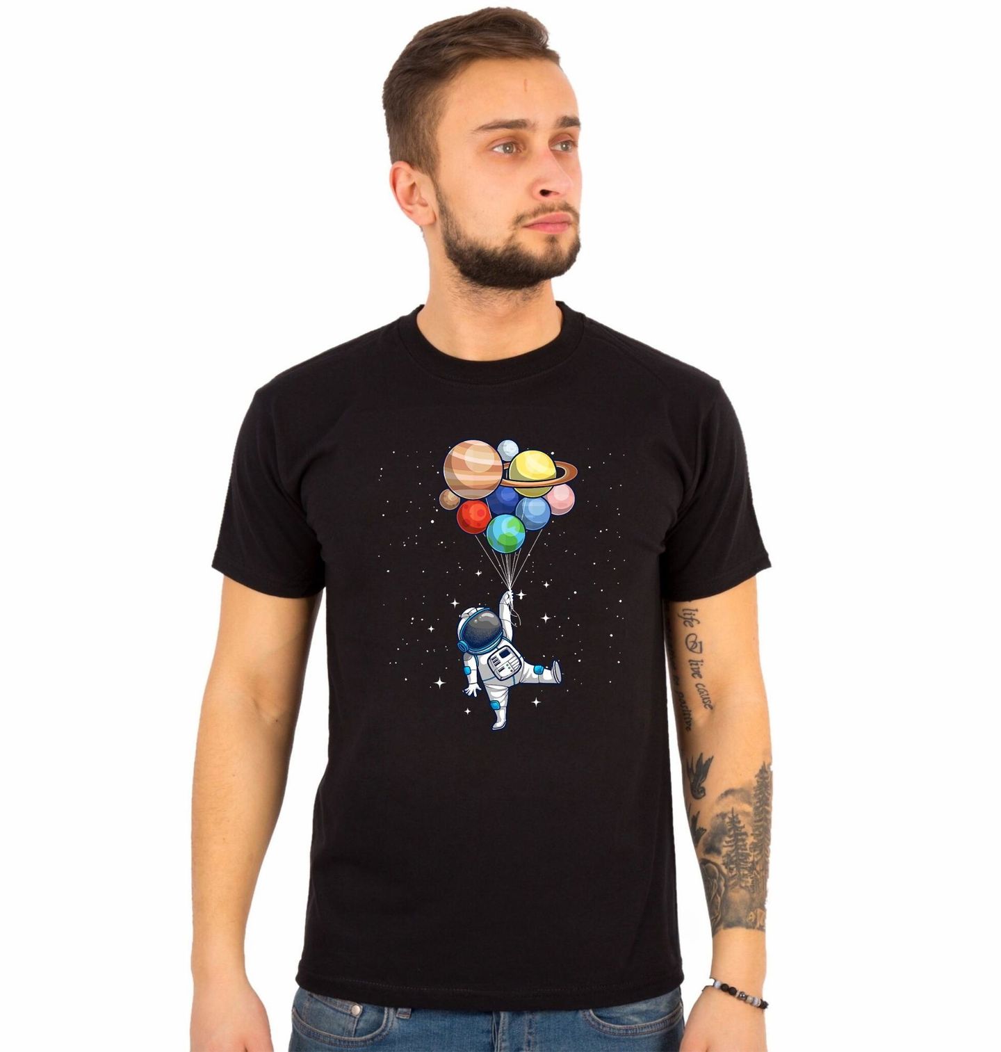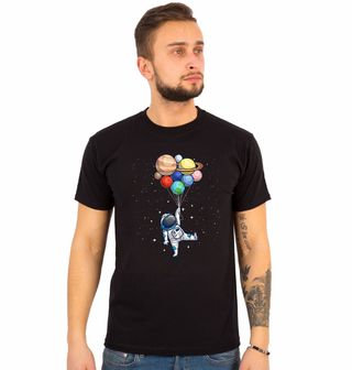 Pánské tričko Vesmírné Dobrodružství Astronauta. Roztomilý astronaut, který se vznáší galaxií zavěšený na baloncích ve tvaru planet, je dokonalým ztělesněním snění, objevování a dětské radosti z nekonečného vesmíru. Barevné planety symbolizují nejen Sluneční soustavu, ale i fantazii, která nezná hranic.
