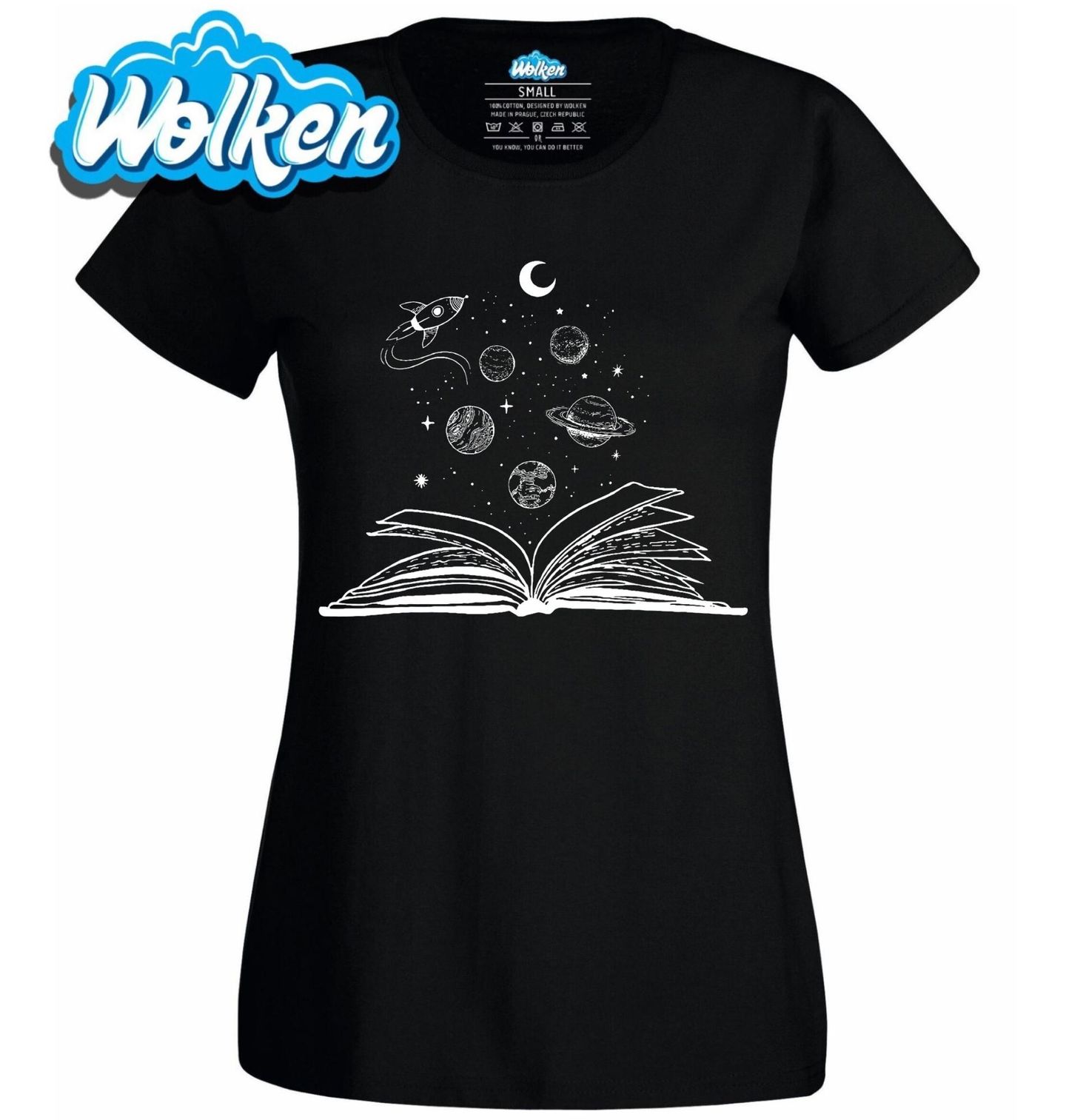 Dámské tričko Vesmírné Příběhy. Když se kniha otevře, začíná cesta do nekonečna. Tento magický motiv spojuje sílu příběhů a krásu vesmíru – raketa, planety, hvězdy a Měsíc vyrůstají z rozevřených stránek jako připomínka toho, že každá stránka může být odrazovým můstkem k novému světu.